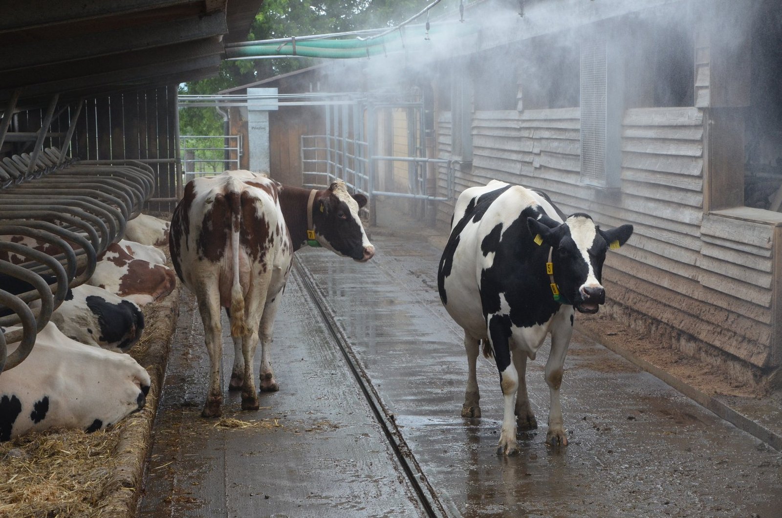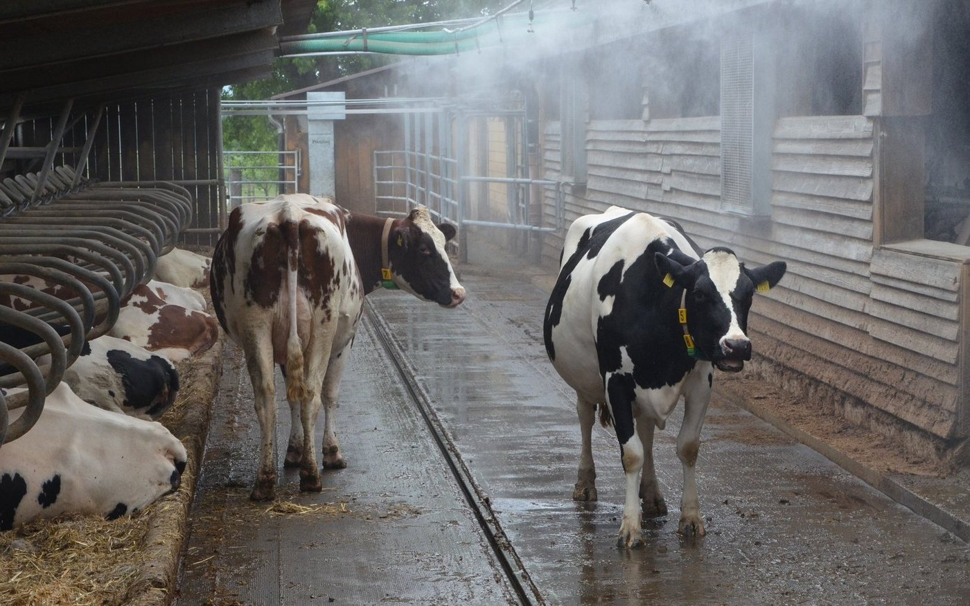 Wichtig ist aber auch hier die Messung der Luftfeuchtigkeit im Stall. Bei einer unsachgemässen Vernebelung oder Berieselung warnen Fachpersonen vor weiterführenden Problemen wie beispielsweise nassem Futter oder nassen Liegeflächen.