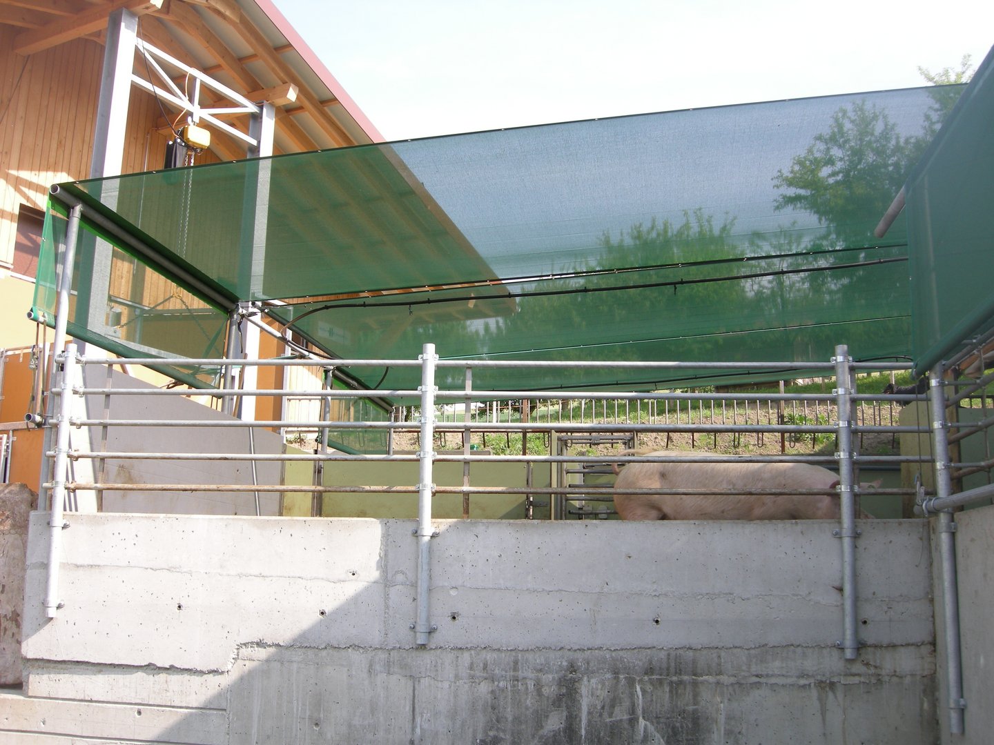 Die Beschattung der Aussenbereiche von Ställen ist besonders bei der Schweinehaltung bekannt - und vor allem wegen der erhöhten Sonnenbrandgefahr wichtig. Dieser Punkt ist auch tierschutzrelevant. Aufgrund der steigenden Intensität der Sommer rückt das Thema Beschattung von Laufhöfen vermehrt auch unter Rinderhaltern ins Zentrum.