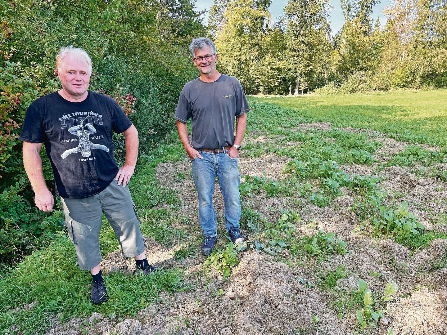 Nun setzen sie wie seit 15 Jahren aufs Einzäunen der Felder. Meldemüde dürfen die Landwirte nicht werden, denn die Auswirkungen sind nicht zu unterschätzen. Wenn ein Drittel des Maisfelds von Wildschweinen ruiniert worden ist, muss man Mais zukaufen, was wiederum Folgen auf die Nährstoffbilanz hat. Oder bei Florian Keller wurde kürzlich eine Acker-Biodiversitätsförderfläche durchwühlt. Mit neuen Bestimmungen werden sofort neue Fragestellungen ausgelöst. Aber sofern sich dort in der aufgewühlten freien Stelle im Saum keine Ackerkratzdisteln, Neophyten oder Blacken einnisten und die Bekämpfungsschwellen nicht überschritten werden, kann dieser laut Strickhof auf jeden Fall zu den 3,5 % BFF-Fläche zugerechnet werden.