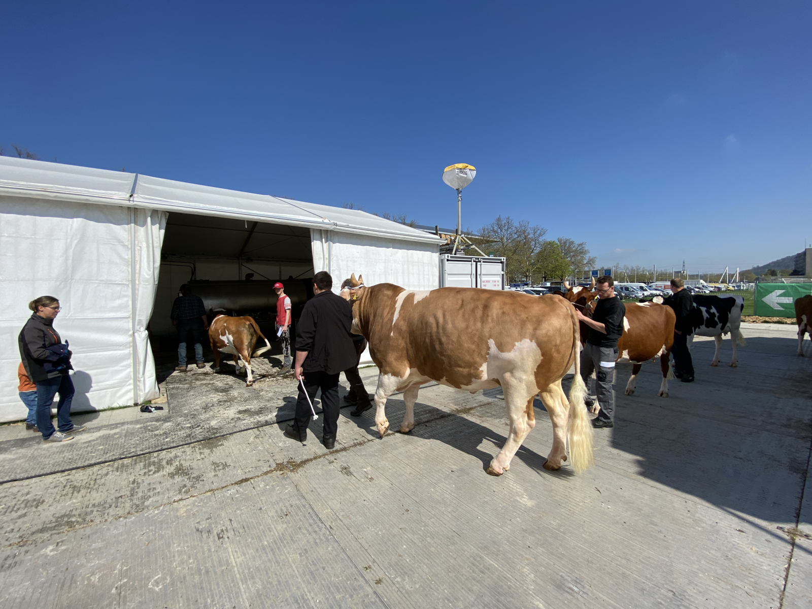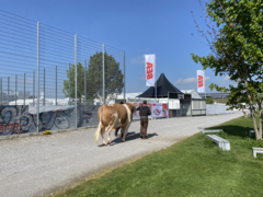 Santos, Martin Liechti und Bernhard Hadorn laufen an den Hallen vorbei. Der Kuhstall mit den Lägern, wo auch der Simmentalerstier die nächsten Tage verbringt, ist ganz hinten. Diverse Fahrzeuge kommen den dreien auf dem schmalen Weg entgegen. An ein Kreuzen ist nicht zu denken, dazu fehlt der Platz. So muss jeweils der Schwächere weichen – natürlich sind es jeweils die Fahrzeuge.