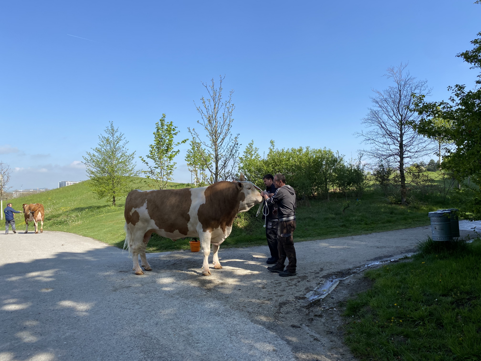 Der dreijährige Koloss läuft gemütlich mit seinen beiden Führern von der Allmend über die Autobahnbrücke in Richtung der Messehallen. Martin Liechti, der links vom Stier läuft, trägt in der linken Hand einen Kessel. Dort ist Santos’ Halsband drin – es ist riesig. Anders kann der sonst in einem eigenen grossen Laufstall im emmentalischen Eggiwil lebende Stier nicht angebunden werden.
