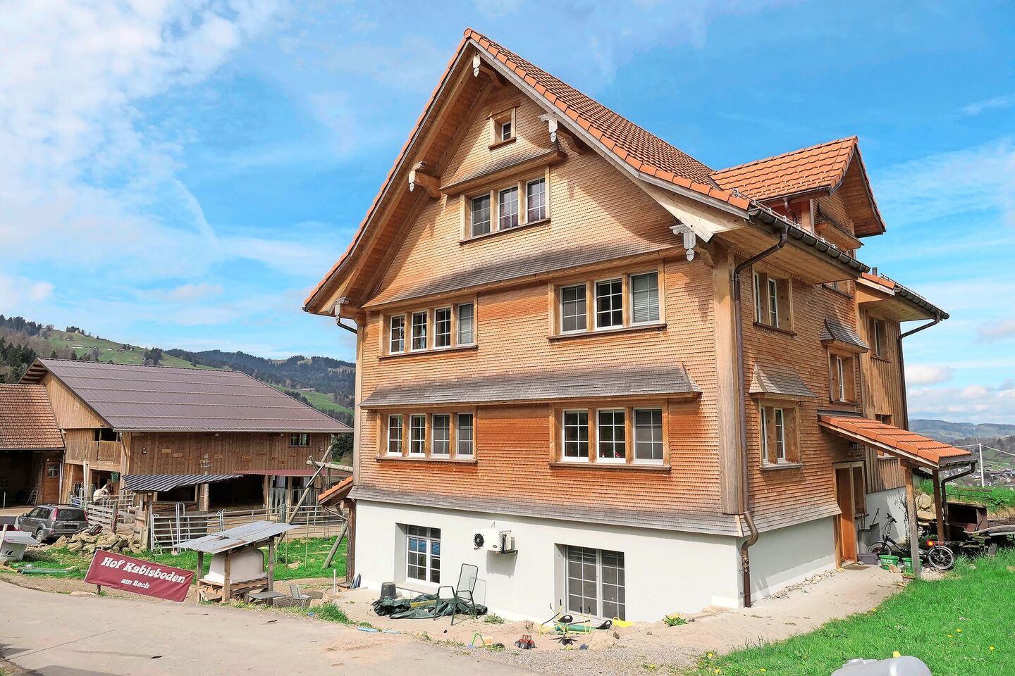 Nachdem Nicole und Hansueli Frey im April 2020 die Baubewilligung erhalten hatten, fingen sie gleich mit dem Hausbau an. Dabei war es von Vorteil, dass der Bauer und sein Vater ursprünglich Zimmermann gelernt hatten. So konnten sie einen Grossteil der Arbeiten in Eigenregie bewältigen, mit Unterstützung von Angehörigen und Freunden. Auch stand etwa ein Bagger zur Verfügung und das Holz kam grösstenteils aus dem eigenen Wald. Es ging zügig voran: Im Juli feierten sie die Aufrichte des Hauses, im September diejenige des Stalls.