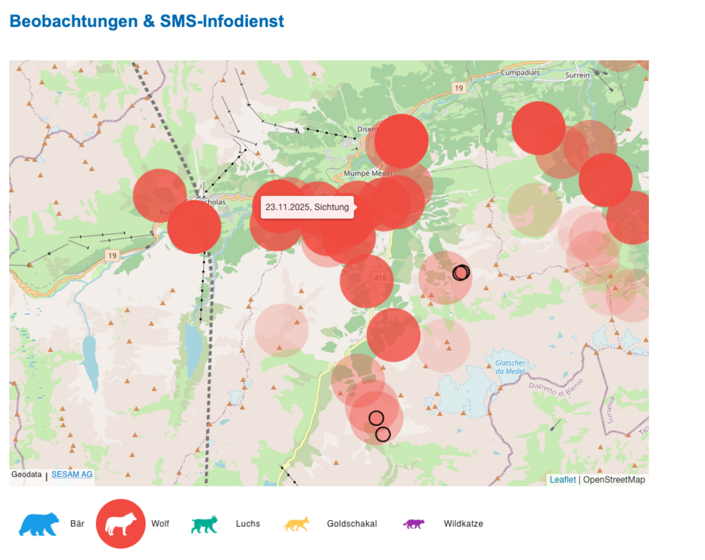 Die Karte des Amts für Jagd und Fischerei Graubünden erzählt eine Geschichte. Rote und rosa Kreise überziehen die Region um Mompé-Medel wie ein dichtes Netz – jede Sichtung, jede Spur, jede Fotofalle des Stagias-Rudels ist dort verzeichnet. Die Wolfspräsenz ist massiv. Und doch fehlen genau dort, wo Pius Manetschs Schafe und Ziegen weiden, die schwarzen Kreise. Sie würden Risse markieren, doch sie sind nicht da. Obschon bei dieser Dichte an Wolfsnachweisen durchaus damit zu rechnen wäre.