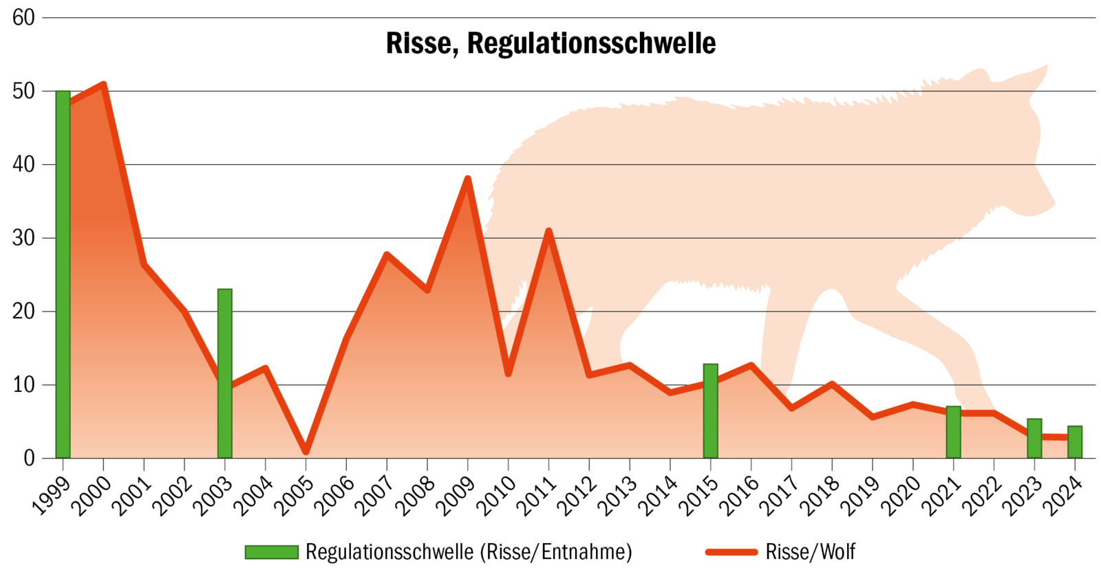 Bis 2004 musste ein Einzelwolf 50 Nutztiere gerissen haben, um zum Abschuss freigegeben zu werden. «Die Schadschwelle wurde laufend reduziert, die Entnahmekriterien differenziert», erläutert Züger. Im Winter 2023/24 bewilligte das Bundesamt für Umwelt (Bafu) erstmals Abschüsse ganzer Rudel, die allerdings nur zum Teil vollständig erlegt werden konnten. Die Warnung von Umweltverbänden, übrig gebliebene Rudelmitglieder würden hohe Folgeschäden verursachen, habe sich nicht bewahrheitet. «Vielmehr gingen in sämtlichen betroffenen Territorien die Nutztierrisse leicht bis sehr deutlich zurück.»