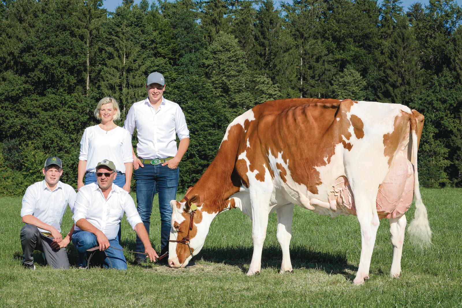 Mit einer durchschnittlichen Milchleistung von 11 748 kg bei 3,79 % Fett und 3,38 % Eiweiss ist die 70-köpfige Kuhherde von Flurys nicht nur leistungsmässig, sondern auch exterieurmässig auf einem hohen Niveau. Vor allem eine Kuh hat vor zehn Jahren Flurys auf einen Schlag ins Rampenlicht befördert: Die rote Ruegruet Joyboy Minapolis, eine Tochter der bekannten Mox Kite Maryrose. «Ich habe 2008 bei Hans Terler aus Österreich Joyboy-Embryonen aus Maryrose gekauft», erzählt der Züchter die Minapolis-Geschichte. Ein Jahr später wurde auf ihrem Betrieb Minapolis geboren.