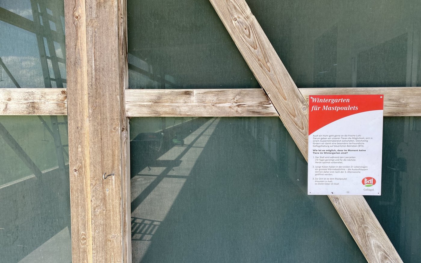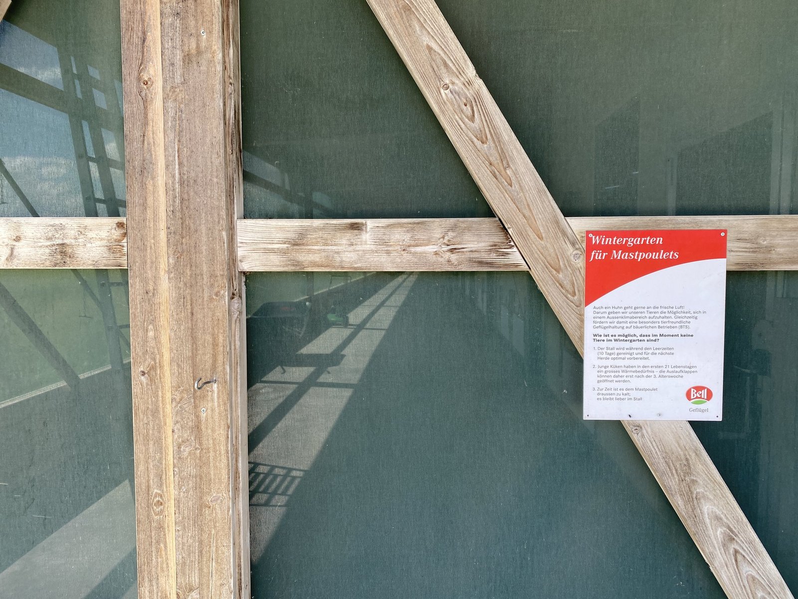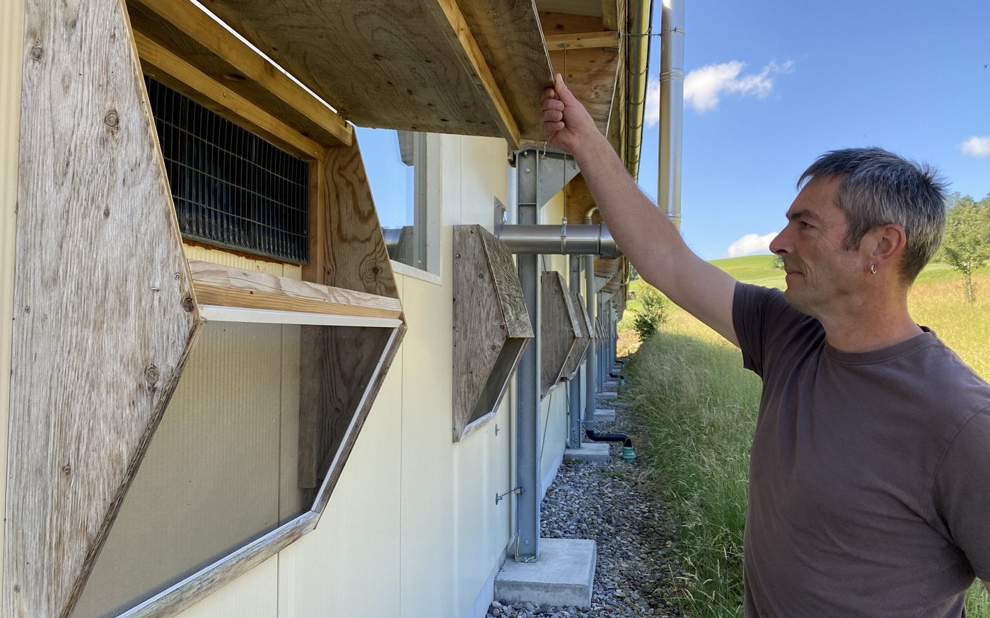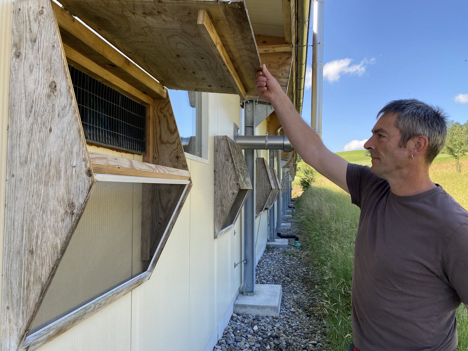 Darüber hinaus haben bei Grods die Tiere ab dem 21. Lebenstag Zugang zum Aussenklimabereich. «Sie dürfen erst nach der 3. Alterswoche nach draussen. Zuvor wäre das Wärmebedürfnis zu gross und sie bleiben besser im warmen Stall», erklärt der Betriebsleiter. Der Aussenklimabereich ist eine Art Wintergarten, eingestreut, überdacht und durch ein Windschutznetz gegen Wind und Vögel (Vogelgrippe) geschützt. Fällt die Temperatur unter einen bestimmten Wert, werden die Auslaufklappen geschlossen. «Bei hohen Temperaturen lasse ich den Auslaufbereich nachts offen. Denn tagsüber bei grosser Hitze bleiben sie lieber im Stall, als rauszugehen.»