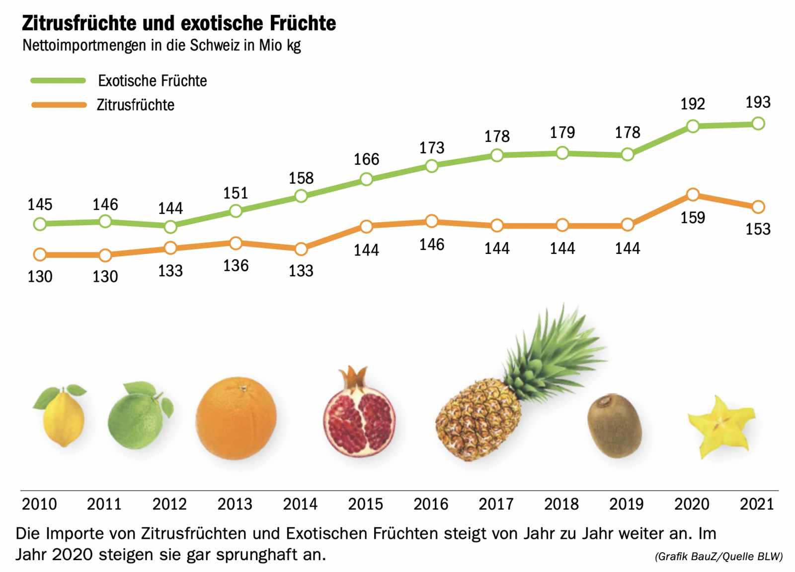 Zitrusfrüchte und exotische Früchte erfreuen sich zunehmender Beliebtheit, das zeigt eine Marktstudie des Bundesamtes für Landwirtschaft (BLW). So wurden im vergangenen Jahr rund ein Drittel mehr exotische Früchte importiert als 2010. Zitrusfrüchte verzeichneten im gleichen Zeitraum einen Anstieg um rund 18 Prozent. 2020 erfolgte ein sprunghafter Anstieg der Frucht-Importe. Die mit Abstand bedeutendsten Produktgruppen waren dabei Bananen (102 Mio kg) und Orangen (74 Mio kg). Wachstumstreiber waren Avocados bei Exoten und Zitronen/Limetten bei Zitrusfrüchten. Im Jahr 2020 wurden 18,9 Mio kg Avocados in die Schweiz importiert, was einer Verdreifachung gegenüber 2010 entspricht. Zum Vergleich: 2020 ass jeder Schweizer laut Agrarbericht 15,4 kg Äpfel, 18,2 kg Zitrusfrüchte und 11,8 kg Bananen.