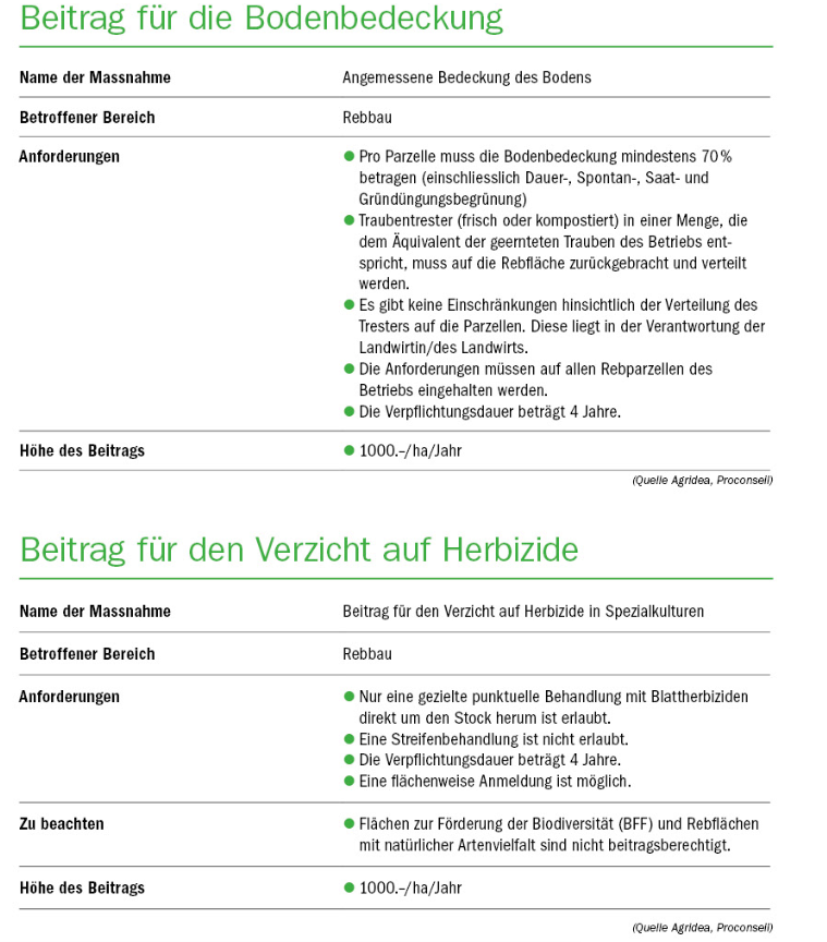 Als Ausgleich zur Senkung des Basisbeitrages können die Beiträge jedoch wichtig sein. Man sollte sich daher gut mit den notwendigen Anforderungen auseinandersetzen. Rebbaubetriebe haben die Möglichkeit, von fünf verschiedenen PSB zu profitieren. Vier Beiträge werden in den Tabellen vorgestellt.