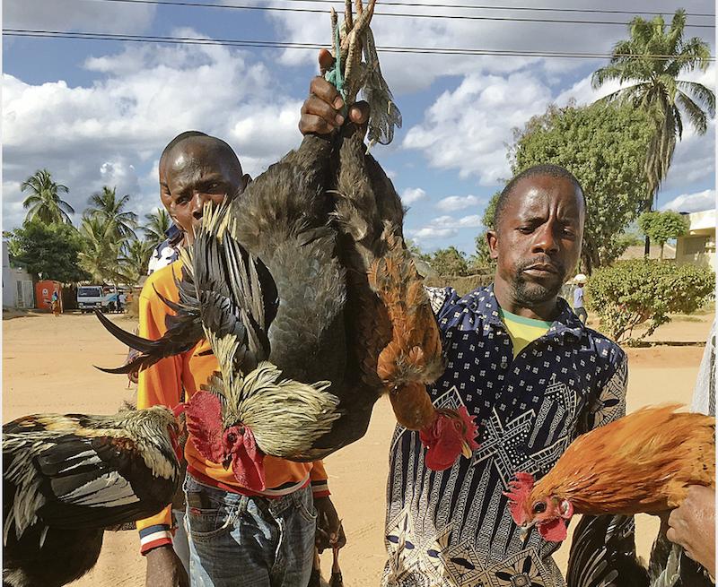 Wir rollen die Fenster herunter und mir wird ein farbiger, flatternder Hahn ins Gesicht gestreckt. Ich erkläre, dass ich kein Interesse habe und noch während ich mein Fenster wieder hoch rolle, rennen die Jugendlichen zum Fenster meines Chefs. Immer noch im Beifahrersitz platziert, analysiert er die schöngefiederten Vögel, die kopfüber in der Luft baumeln. Er nimmt einen auf den Schoss, untersucht ihn und fragt nach dem Preis. Nach einer hitzigen Diskussion scheinen sie sich schliesslich einig zu sein. Langsam begreife ich, dass uns diese ungezähmte Schar Hühner auf der Heimkehr Richtung Nampula begleiten wird, verteilt auf den Schossen der Mitfahrer.
