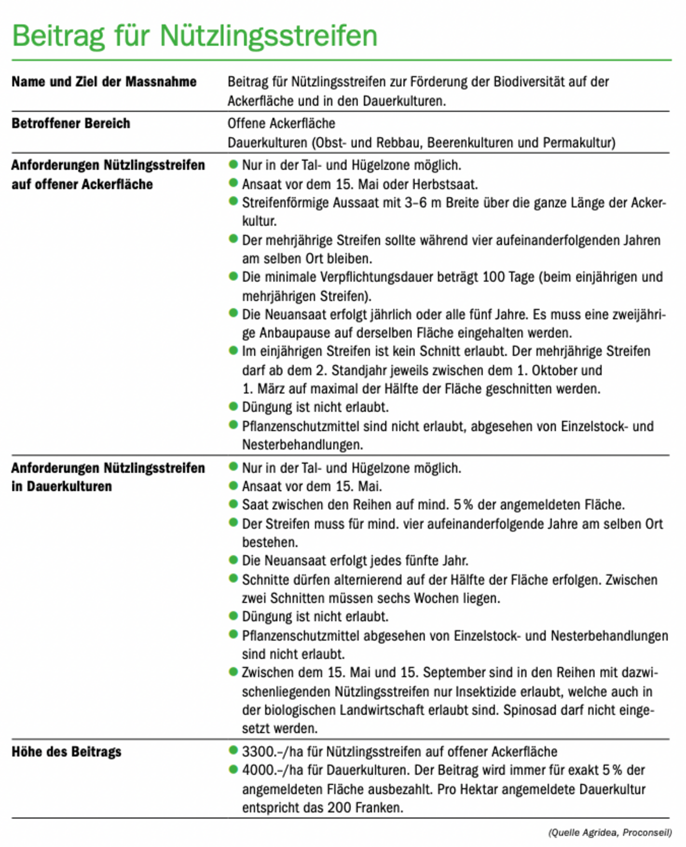 Eine weitere Massnahme sind die Nützlingsstreifen. Sie ersetzen die Blühstreifen für Bestäuber und andere Nützlinge. Mit den Nützlingsstreifen soll die funktionelle Biodiversität gefördert werden. Durch die Förderung der natürlichen Kontrolle von Schädlingen kann der PSM-Einsatz reduziert werden. Neu können die Streifen auch in Dauerkulturen angelegt werden und es gibt mehrjährige Saatmischungen. Es sind allerdings nur die vom BLW bewilligten Mischungen zugelassen.