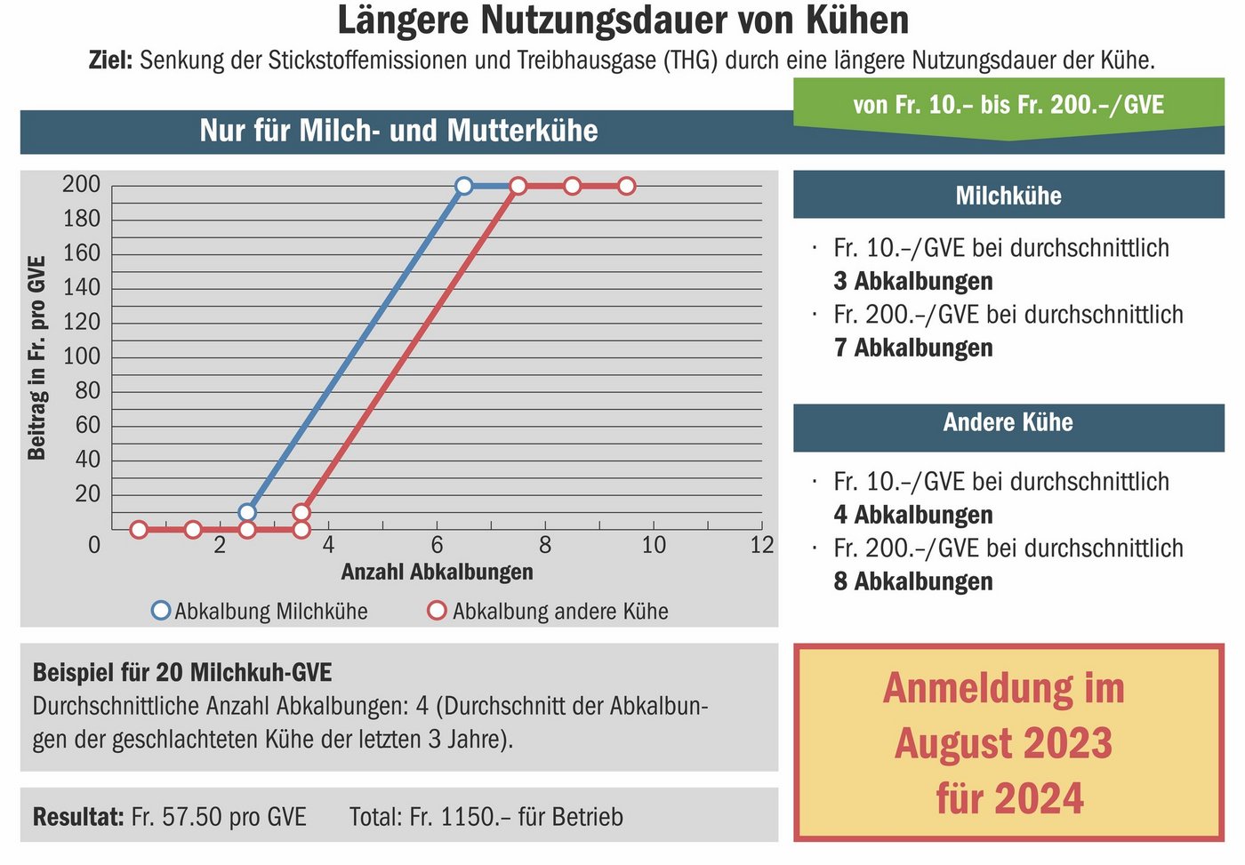 Für einen Bestand von 20 Grossvieheinheiten (GVE) Milchkühe mit durchschnittlich vier Laktationen würde der Beitrag Fr. 57.50/GVE Milchkühe oder Fr. 1150.–/Jahr betragen. Ein Mutterkuhbetrieb mit demselben Bestand würde denselben Beitrag erhalten, wenn die Kühe durchschnittlich fünf Laktationen haben. Die Anmeldung für diesen Beitrag wird erst im nächsten August 2023 für 2024 beginnen.