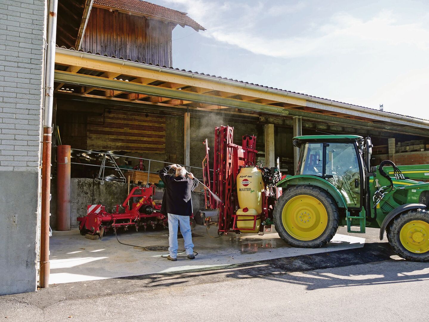 Das Befüllen der Spritze beispielsweise muss zwingend auf einem regelkonformen Befüllplatz erfolgen. Dieser wird idealerweise mit dem Waschplatz kombiniert, sofern die Reinigung nicht auf dem Feld erfolgt. Diese Sicherheitsvorkehrungen sind auch für das Befüllen von Geräten mit kleineren Tankvolumina (z.B. Rückenspritzen oder Spritzgeräte für Kleinparzellen im Obst- und Weinbau) vorzunehmen. Statt eines stationären, armierten Befüllplatzes bieten sich hierfür auch mobile Lösungen in Form einer dichten Blache mit Randbordüre an. Für den Fall, dass beim Befüllen tatsächlich mal etwas daneben geht, sollte Bindemittel (z.B. Sägemehl oder Katzenstreu) mitgeführt werden.
