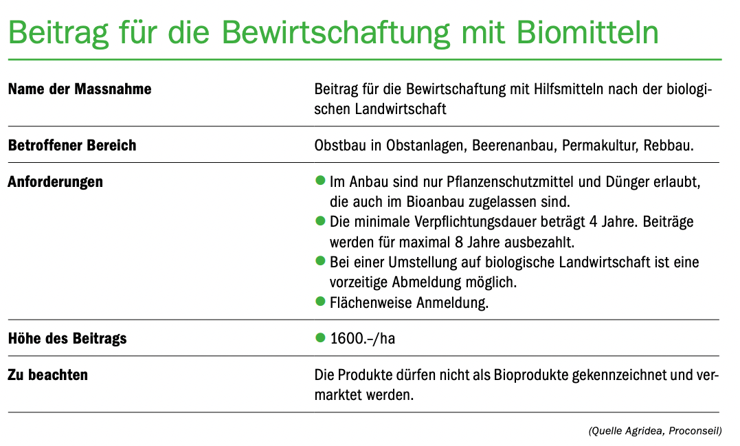 Parallel zu den Änderungen für die einjährigen Spezialkulturen und den Rebbau gibt es mit der neuen Agrarpolitik auch Anpassungen beim Obstbau. Diese Änderungen umfassen strengere Anforderungen an den ökologischen Leistungsnachweis sowie freiwillige Massnahmen. Eine dieser Neuerungen ist die Reduktion der Abdrift und Abschwemmung um mindestens einen Punkt. Die Reduktion der Abschwemmung muss auf allen Parzellen eingehalten werden, die mehr als 2 % Neigung aufweisen und in Richtung Gefälle an Oberflächengewässer und entwässerte Strassen oder Wege angrenzen. Dies wird durch die begrünten Fahrgassen und Vorgewende bereits erfüllt.