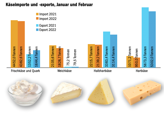Rückläufig sind aber auch die Importe, hier betrug der Rückgang im Februar 6,7 %, für die ersten zwei Monate waren es 4,9 %. Am stärksten gelitten hat das Weichkäse-Segment mit 13,1 % Abnahme. Die Zahlen sind allerdings noch mit Vorsicht zu geniessen, da sie stark abhängig sind von Aktivitäten zur Verkaufsförderung und Lieferterminen, welche saisonal variieren.
