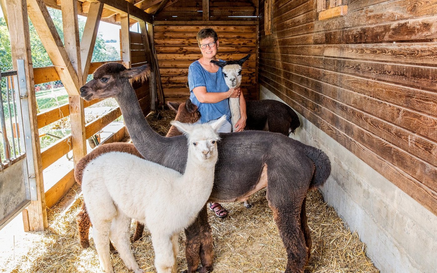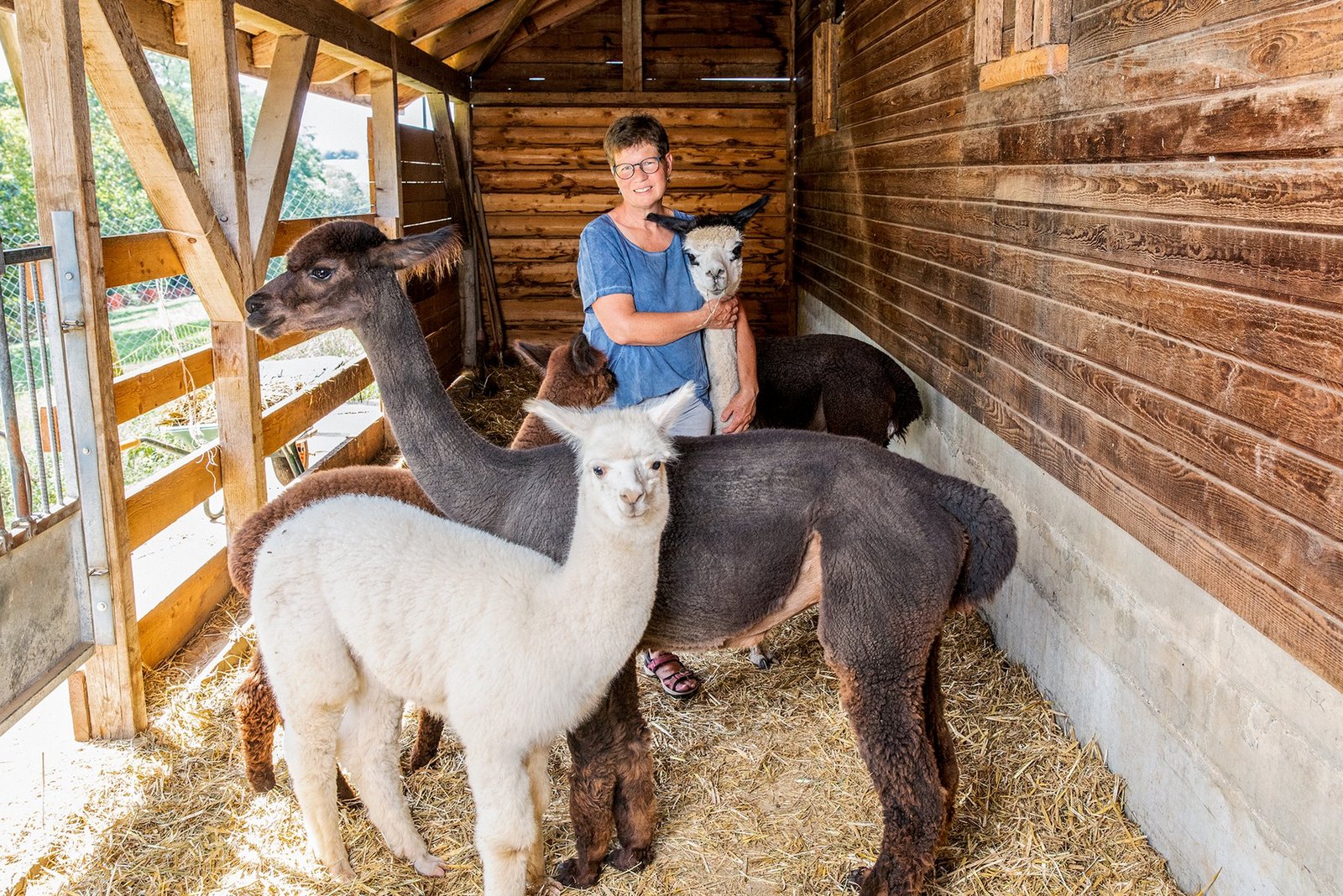 Auch ihre Tiere, an denen sie Freude hat, spielen auf dem Hof eine wichtige Rolle. «Die Alpakas habe ich als Herdenschutz für die Hühner», sagt Agnes Hügli. Und fügt schmunzelnd hinzu: «Mit diesem Argument konnte ich wenigstens meinen Mann überzeugen.» Tatsächlich habe sich gezeigt, dass der Fuchs Respekt vor den Tieren habe. «Es funktioniert», sagt sie. Und tüftelt bereits an einer neuen Geschäftsidee herum: «Ich möchte die Wolle nicht einfach als Dünger verwenden, sondern verwerten». Die Wolle soll in der Schweiz gesponnen und zu hochwertigen Textilien verarbeitet werden.