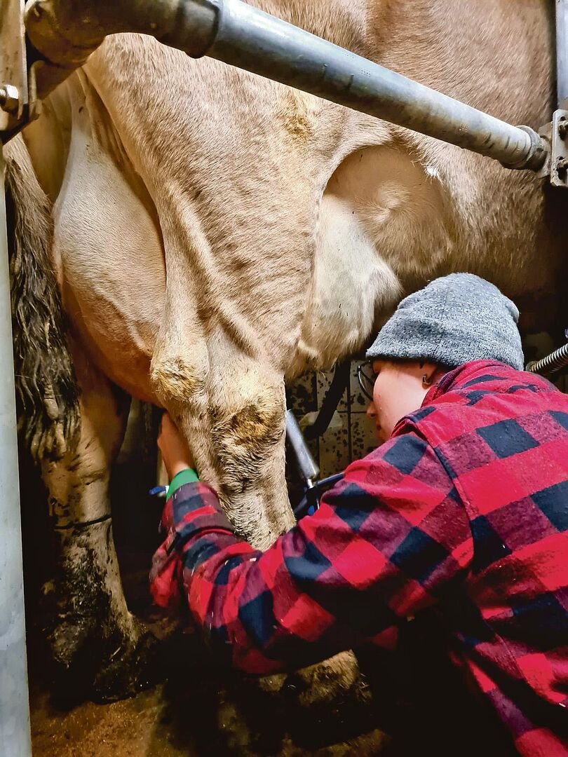 In unserem Stall stehen rund 40 Brown-Swiss-Kühe, Aufzuchtrinder für die eigene Nachzucht und Kälber. Für mich als Lernende, die nicht auf einem landwirtschaftlichen Betrieb aufgewachsen ist, ist es herausfordernd und spannend, die verschiedenen Arbeiten einer Landwirtin zu erlernen. Mir gefällt vor allem das Melken, weil es spannend ist, zu sehen, welche Leistung eine Kuh erbringen kann. Genauso finde ich es gut, dass man vieles über die Verhaltensweise der Tiere lernt.