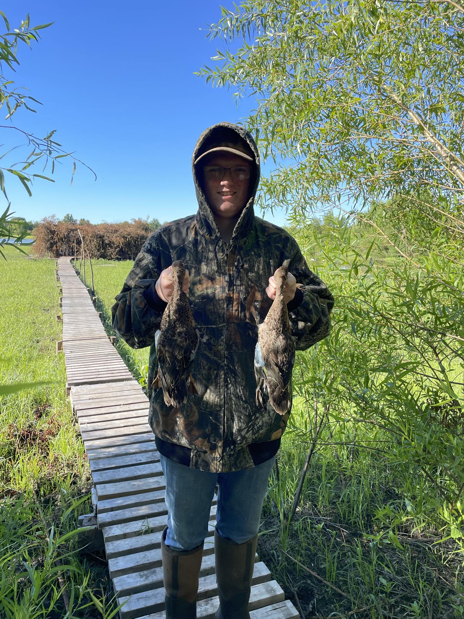Ein paar Stunden später schickt mir Adam das erste Foto. Aiden hat seine ersten Enten geschossen. Mit einem Schuss hat er sogar zwei Enten erlegt. Was für ein Glück! Ich bin mir nicht sicher, wer mehr Freude hat, Adam oder Aiden.