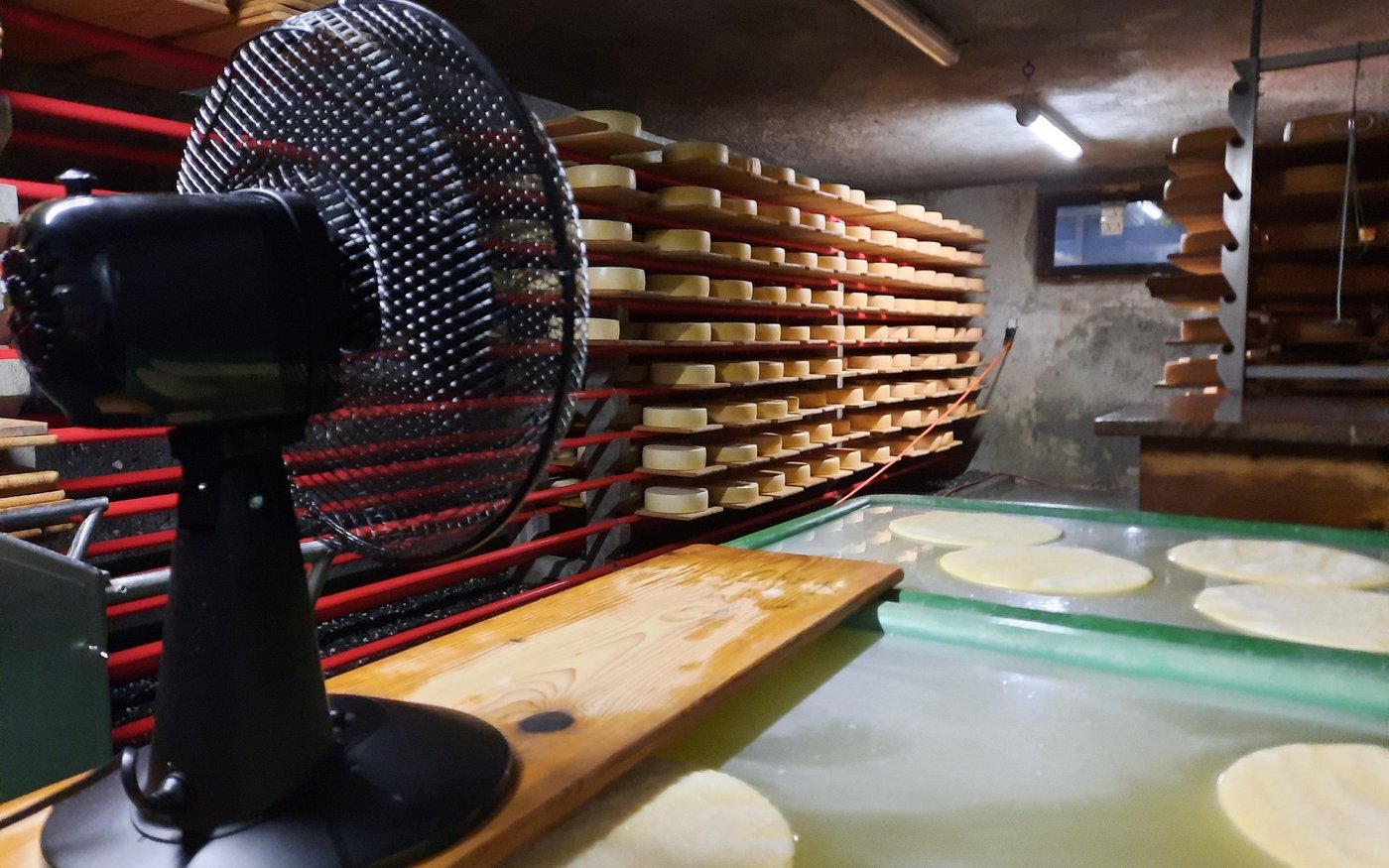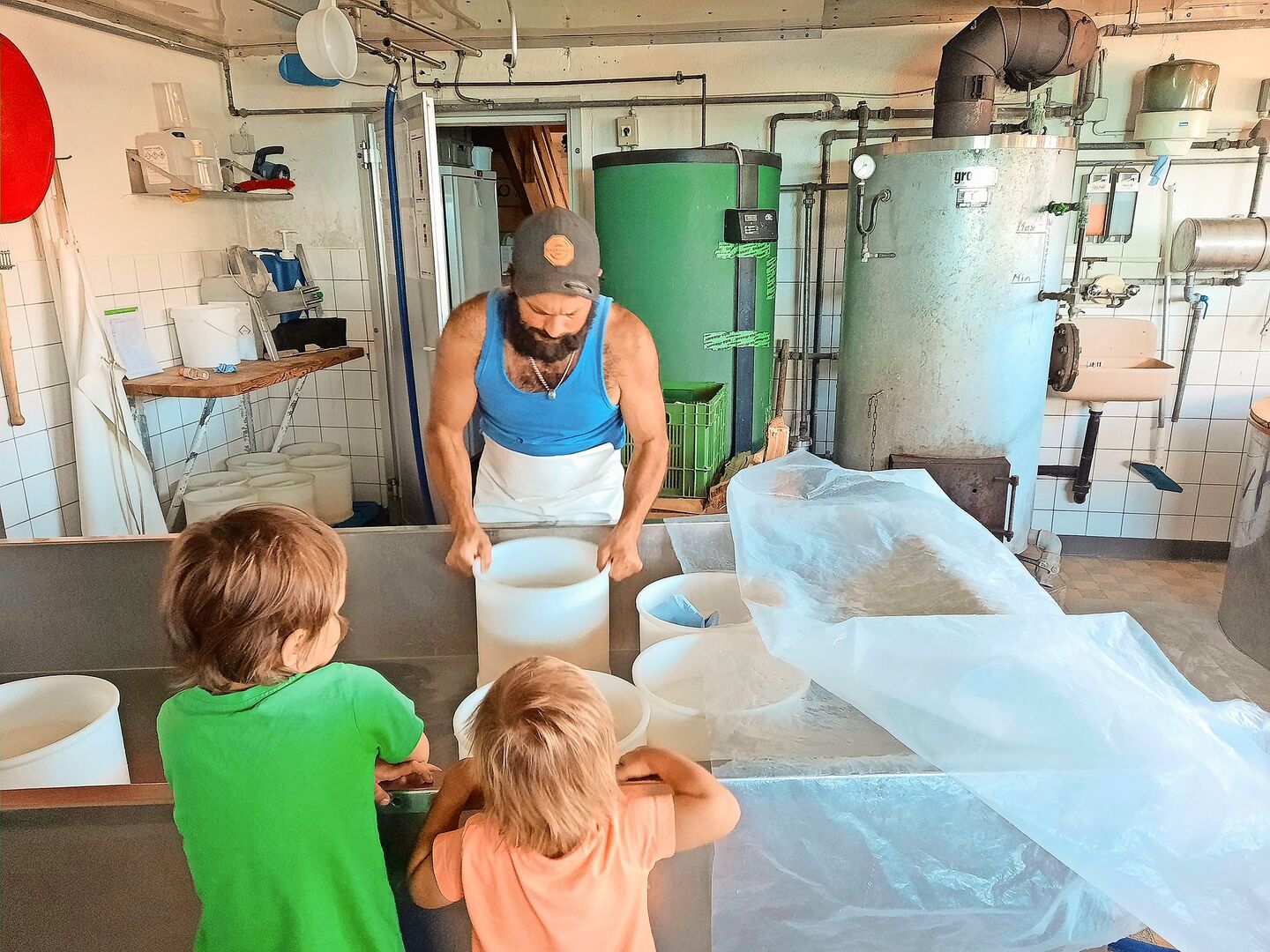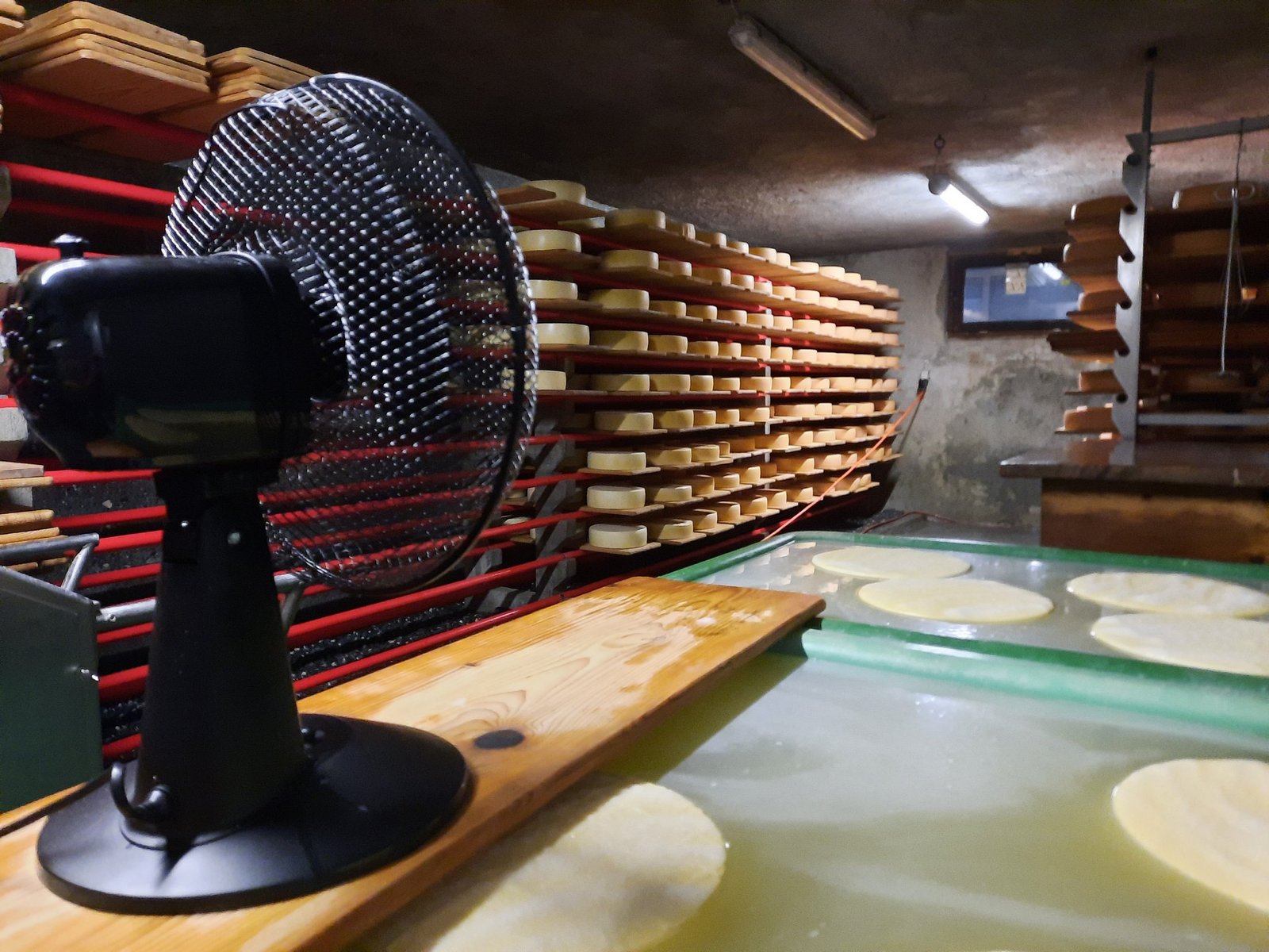 Ronya inspiziert den Käsekeller: «Mami, es het en neue Venti geh», informiert sie mich. Mit 16 Grad Celsius ist es momentan eher warm im Keller, ideal wäre eine Kellertemperatur zwischen 12 und 14 Grad. Mit kaltem Wasser und dem Ventilator versucht Reto, die Temperatur zu verringern. Weiter erklärt mir unsere kleine Sennerin, dass es neue Kümmelmutschli gegeben hat.