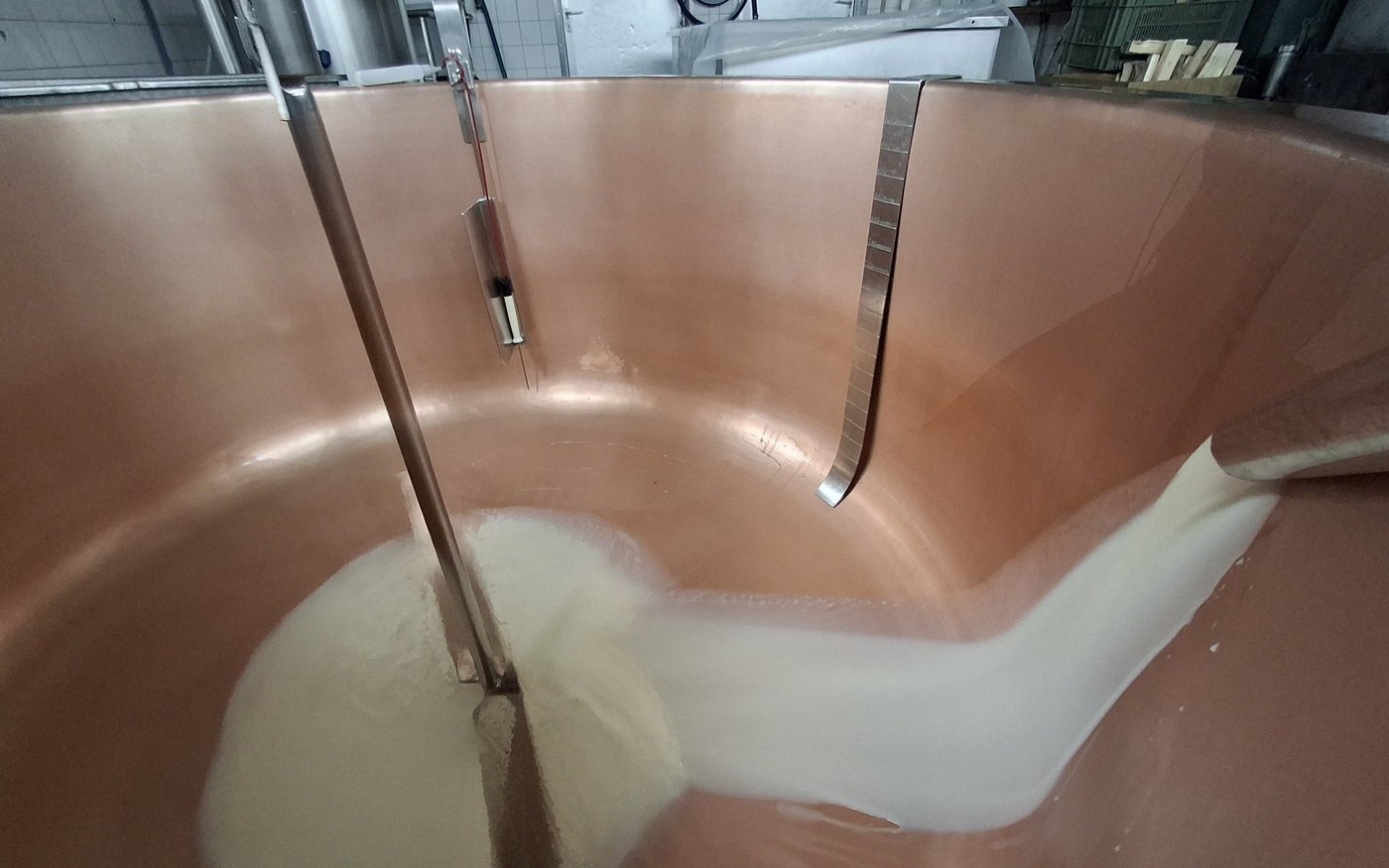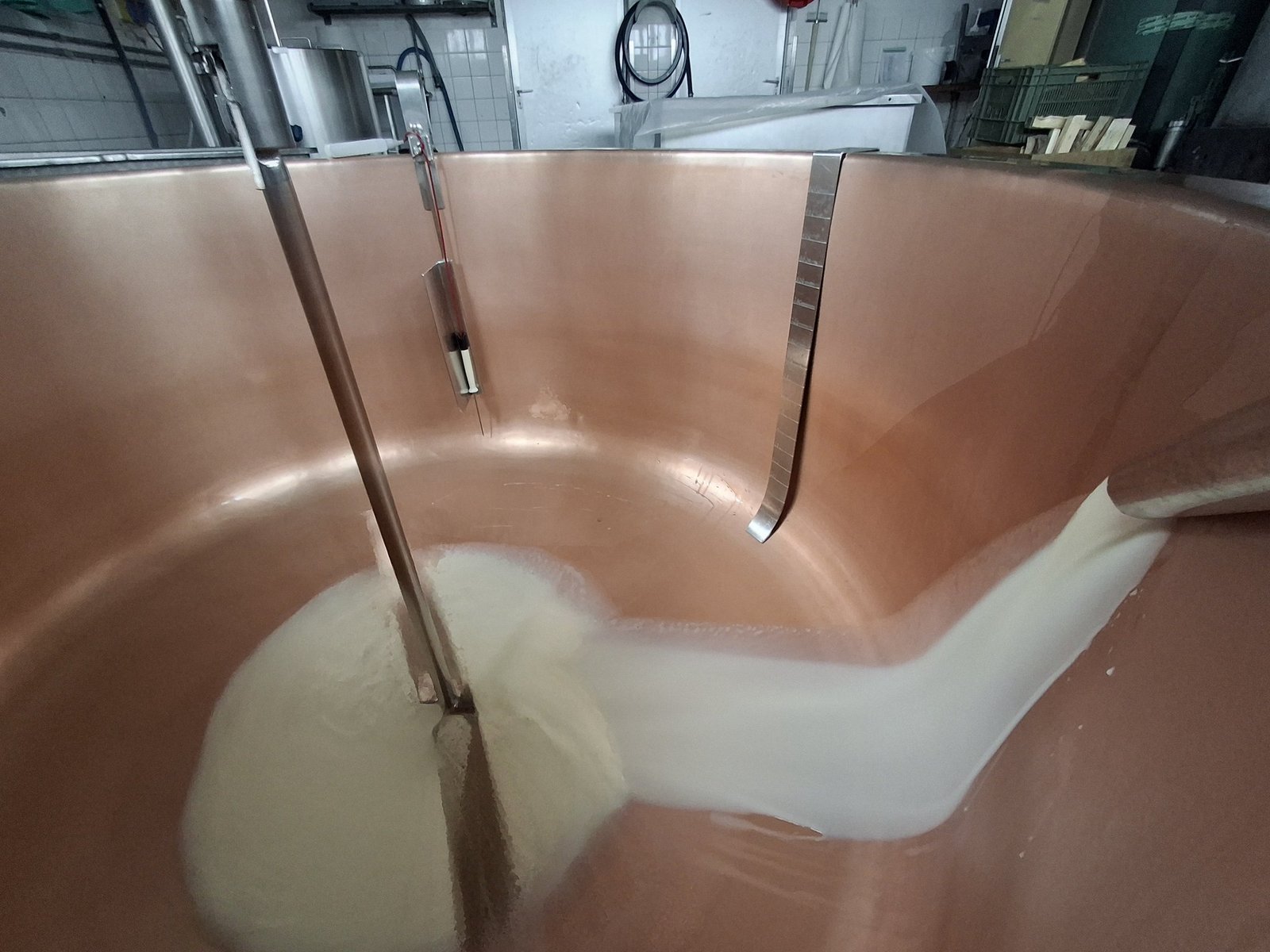 Auch die Milch ist stark zurückgegangen. Knapp 500 Liter pro Tag von 70 Kühen, gestartet hatten wir mit 107 Laktierenden und über 1200 Liter Milch. Reto beschliesst, dass wir ab morgen die Milch überstellen werden. Das bedeutet, dass ab jetzt bis Ende Sommer nur noch jeden zweiten Tag gekäst wird. Die Milch von Samstagabend und Sonntag lagern wir in einer Kühlwanne bei unter 6 Grad. Am Montagmorgen wird Reto diese Milch mit der frischen mischen und mit Seraina verkäsen.
