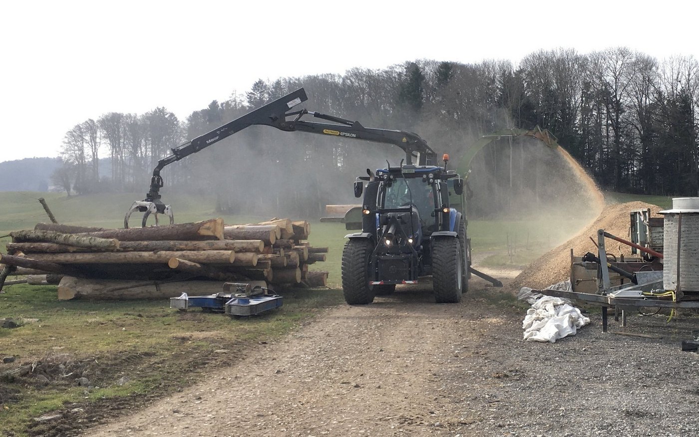Diese Woche kam eine grosse Holzhäckselmaschine vorbei, um die Baumstämme, die im Winter gefällt wurden, zu Schnitzeln zu verarbeiten. Diese werden zum Heizen gebraucht. Es war recht beeindruckend, wie die Maschine dicke Baumstämme in kürzester Zeit in kleine Stücke schredderte.