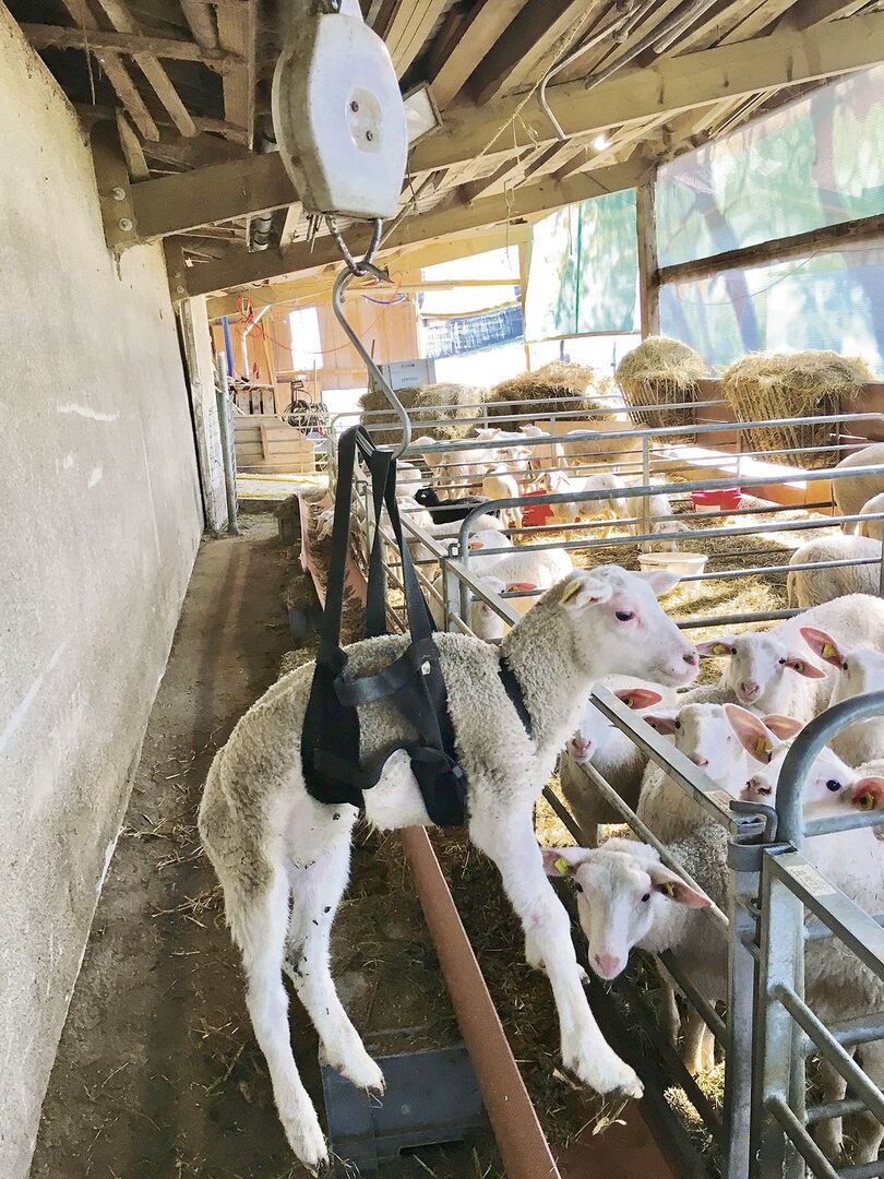 Am Montag wollten wir endlich wissen, wie schwer die grössten Lämmer schon waren. Wir schnappten uns also das grösste Lamm und hängten es mit Tragegurten an der Waage auf. Tatsächlich war dieses Lamm schon 26 kg schwer. Also höchste Zeit für die Metzg. Tags darauf konnten wir dann sechs Lämmer aufladen.