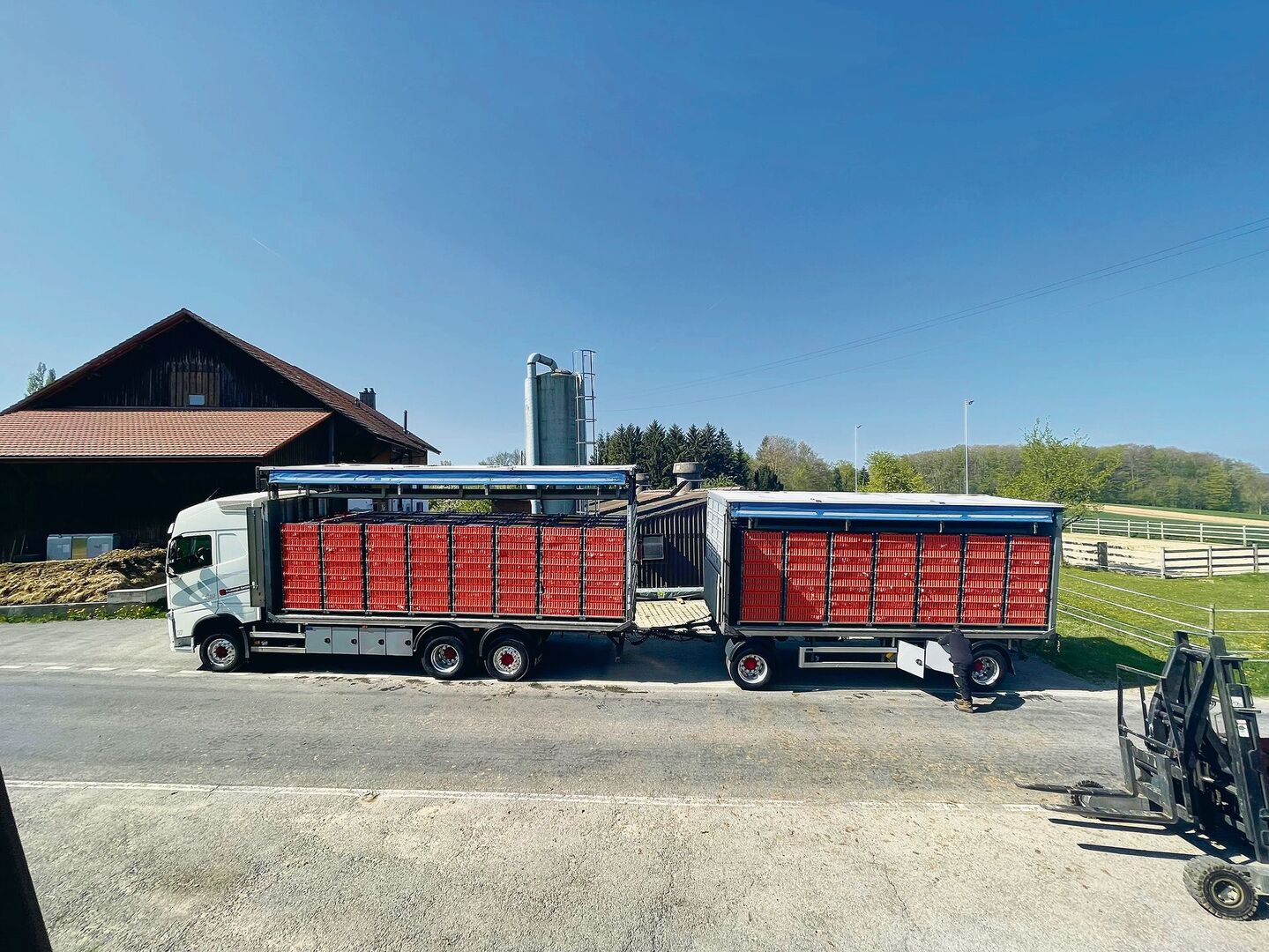 Nach 35 Tagen Mast war am 28. April um 10 Uhr Verladezeit für knapp 4500 Poulets meines Praktikumsbetriebs. Eine sehr praktische Zeit zum Verladen – nicht mitten in der Nacht und nicht während den Stallzeiten. Acht Stunden vor dem Verladetermin räumen wir das Futterband weg, denn die Poulets dürfen nur nüchtern verladen werden. Der Zugang zum Wasser muss allerdings gewährleistet sein. Mein Praktikumsbetrieb produziert Optigal-Poulets in Zusammenarbeit mit der Firma Micarna.