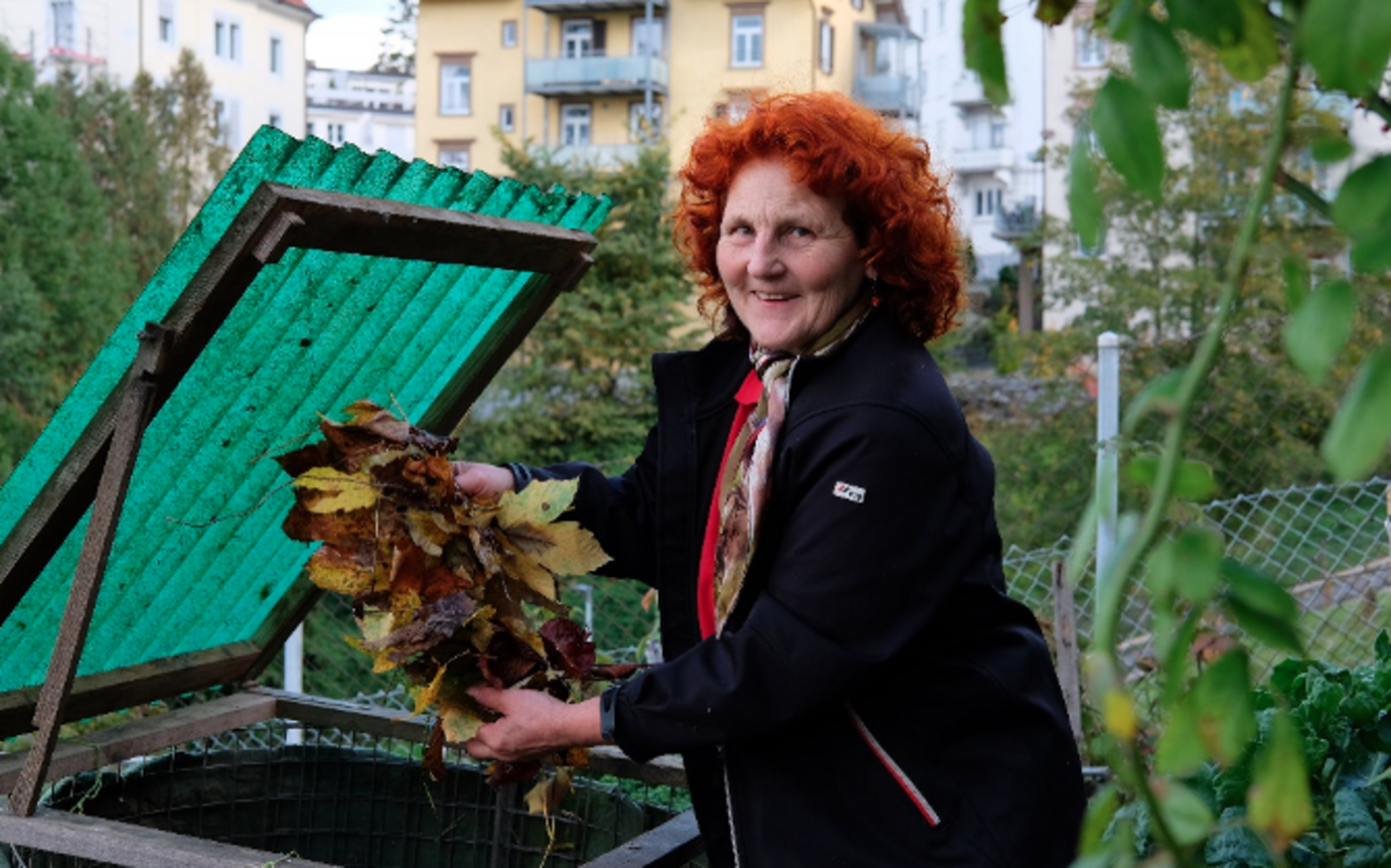 «Dann heisst es mischen, mischen, mischen», sagt Marianne Meili. Das bedeutet, dass man jedes Mal, wenn man etwas in den Kompost gibt, das neue Material gleich untermischt und so den Inhalt lockert. «Je mehr Sauerstoff in den Kompost kommt, desto schneller reift er.» Wichtig sei zudem, dass alles Kompostiergut auf Fingerlänge zerkleinert wird: Rüstabfälle genauso wie Stängel oder Ranken. Trockenes, stark gerbstoffhaltiges Laub kann man vor dem Einfüllen mit dem Rasenmäher schreddern; so verrottet es schneller.