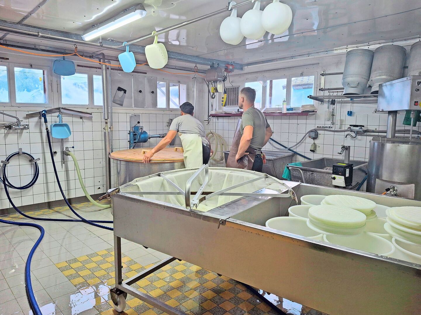 Aus der Käserei klingt laute Musik, das ist ein gutes Zeichen. Zusammen mit den Kindern putzen Reto und Stefanie die Käsereiutensilien. Stolz zeigt Ronya ihre Sennerinnenschürze. Als ich die Käserei betreten will, ruft sie energisch: «Mami, nöd mit dene Schuhe id ChChccccccccChäsi, nur mit de Chäsistiefel!»