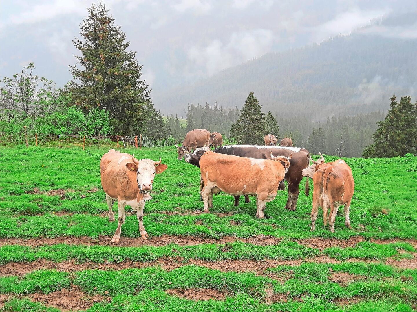 Trotz Kälte und Regen kommen endlich die Kühe. Die Einheimischen laufen vom Dorf zu uns hoch. Ronya möchte unbedingt mitlaufen, also schnappen wir uns unsere Regenklamotten und Treiberstöcke und gehen der Gruppe entgegen. Schellen klingen, Kühe muhen, es werden Hände geschüttelt und fleissig wird gefachsimpelt über Wetter, Gras und Kühe. Ach, wie habe ich das vermisst. Während die ersten Vierbeiner bereits auf den Weiden stehen, fahren weitere Lastwagen auf den Platz.