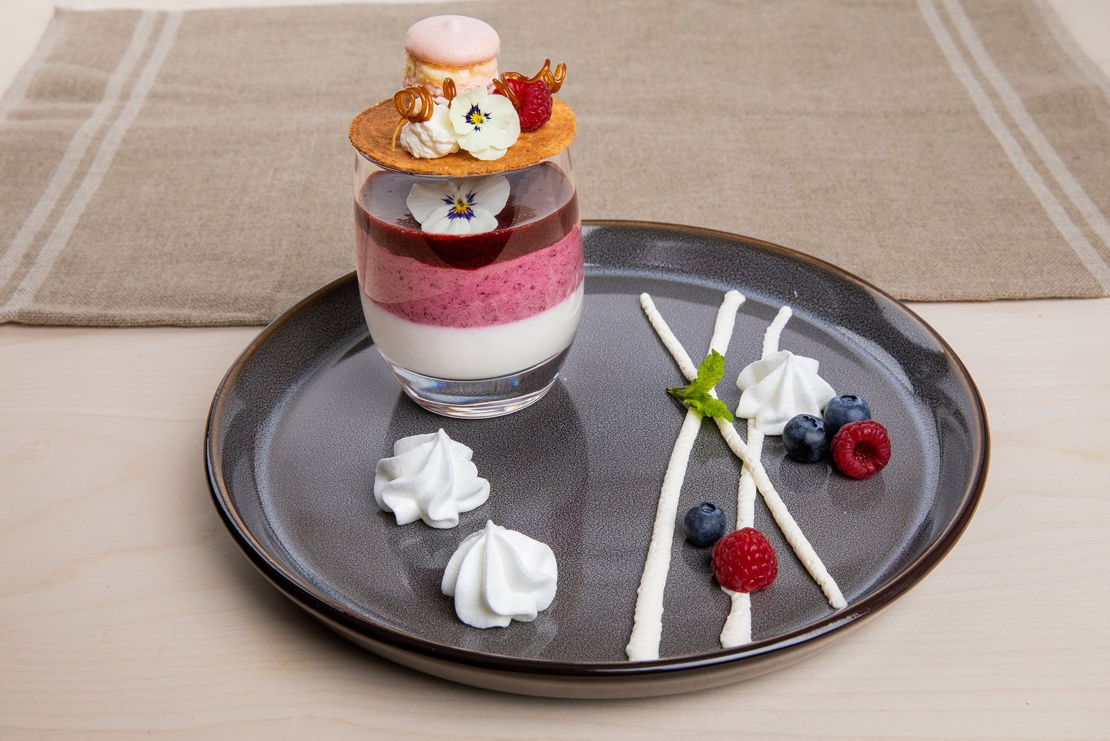 Das Dessertglas aus dem Kühlschrank nehmen und auf Dessertteller stellen. Das Glas mit einem Bretzeli belegen. ein Macaron darauf anrichten und mit Meringues, Ricola-Spirale und Beeren ausgarnieren. Den Teller mit Schlagrahm, Meringues, Beeren (Himbeeren, Johannisbeeren und Heidelbeeren) und Stiefmütterchen ausgarnieren.