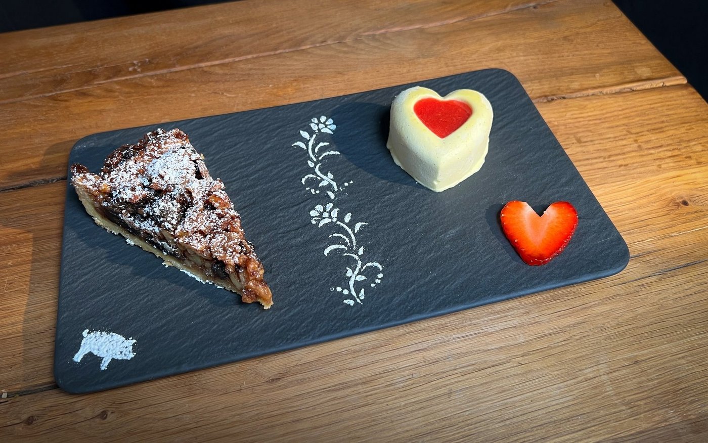 Baumnusstarte aus der Form nehmen und in Stücke schneiden. Auf jeden Dessertteller 1 Stück Baumnusstarte anrichten. Eine Kugel Vanille Parfait dazu dressieren.
