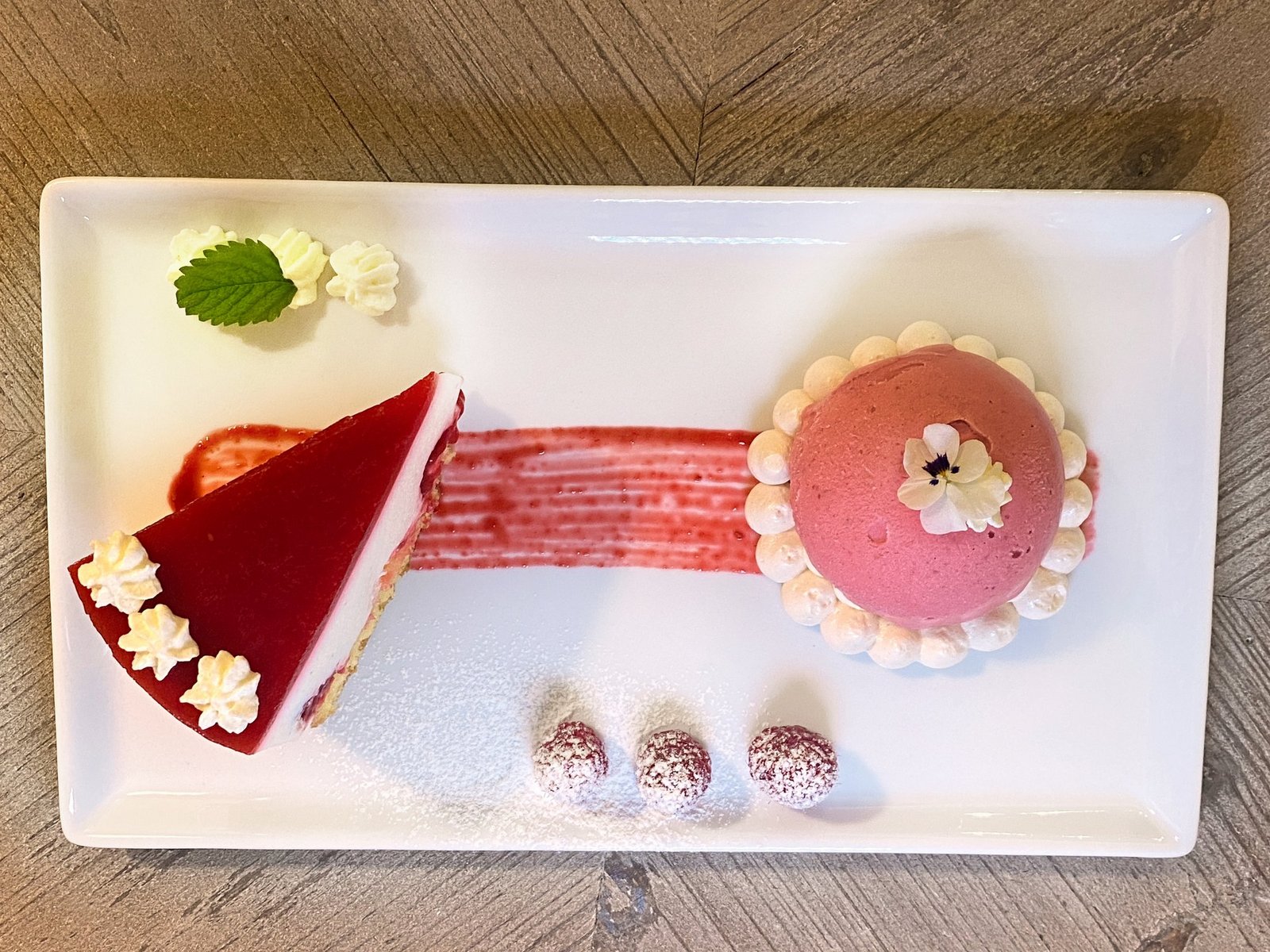 Je ein Stück Torte auf einen Dessertteller anrichten. Meringue daneben platzieren. Je eine Kugel Himbeerglace auf der Meringue anrichten. Den Teller mit den Himbeeren und Minzblättern ausgarnieren.