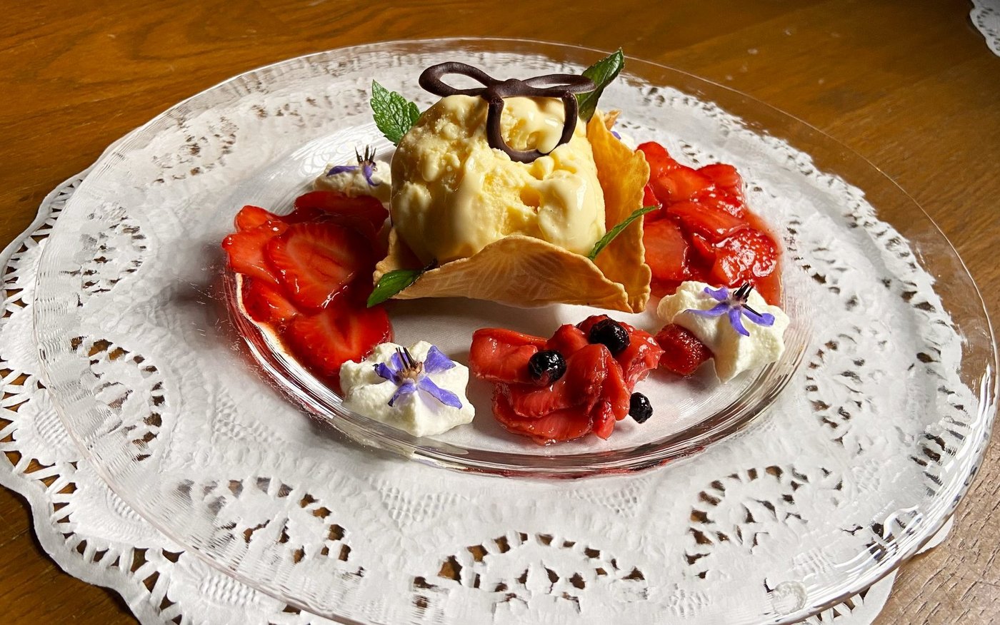 Je 1 Brezeli-Chörbli auf Dessertteller stellen. Mit einer Kugel Schokoladeglace füllen. Diese mit flüssiger Schokolade übergiessen. Erdbeer-Aronia-Kompott um die Glacekugel verteilen. Mit Rahm ausgarnieren.