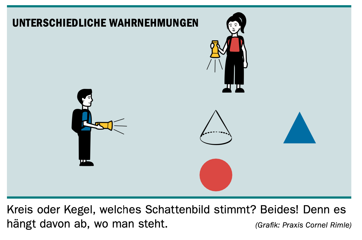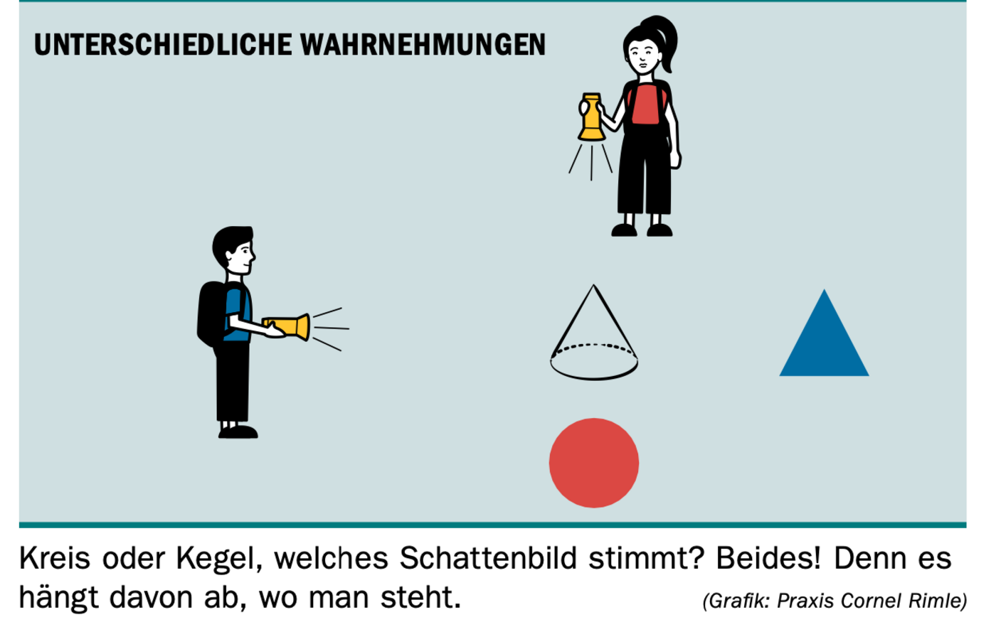 In der Mitte ist der Kegel. So wie ihn der Mann beleuchtet, zeigt sich ein Schattenbild eines Dreiecks. So wie ihn die Frau beleuchtet, zeigt sich ein Schattenbild eines Kreises. Symbolisch entsprechen die Schattenbilder den subjektiven Wahrnehmungen der Situation.