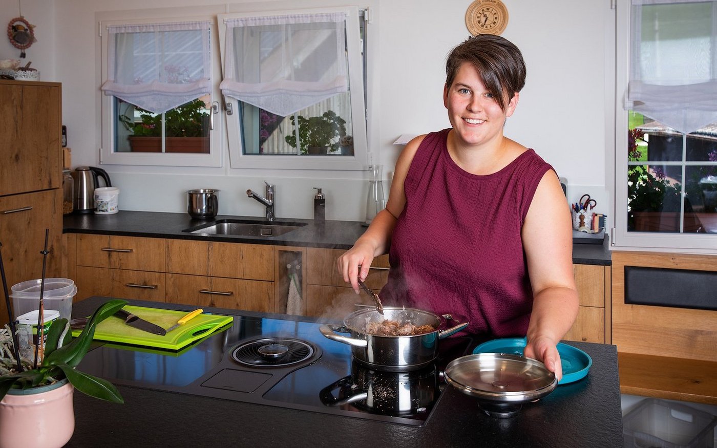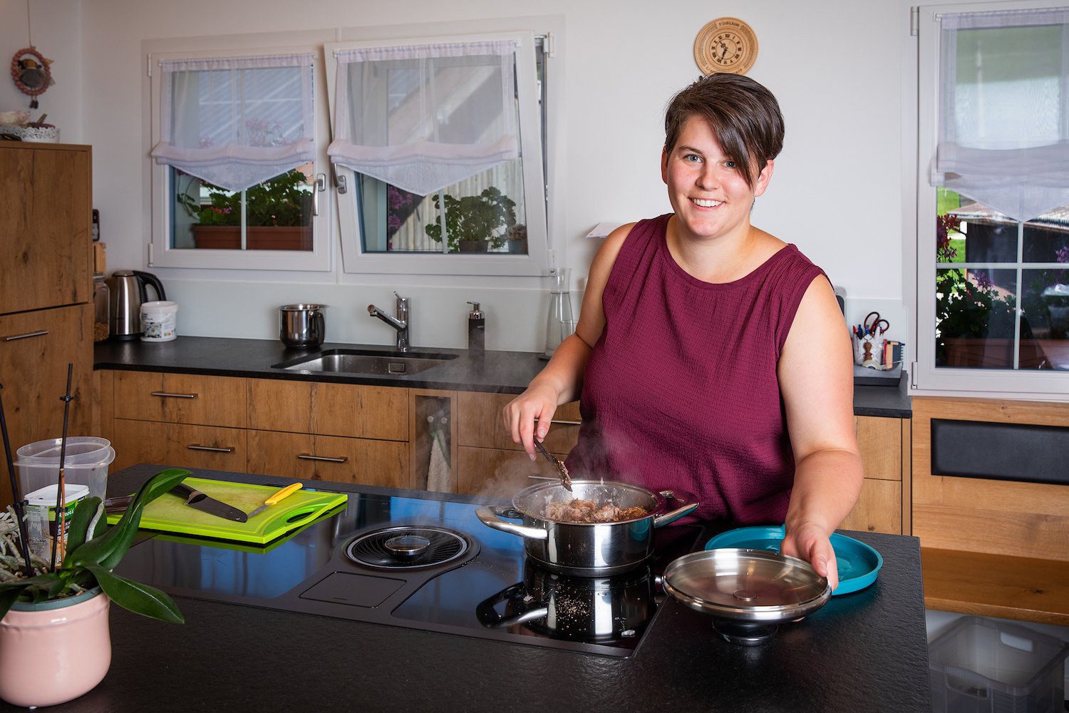 «In der Landfrauenküche haben die Frauen teilweise so moderne Küchen», hat Fränzi Mori beobachtet. Die gelernte Konditorin aus Kallnach BE kocht selbst mit einer 50 Jahre alten Einrichtung. «Ich will zeigen, dass das auch geht», erklärt die 37-Jährige einen der Gründe für ihre Teilnahme an der Sendung. Neben ihrem Teilzeitpensum in einer Bäckerei, in der sie vornehmlich nachts arbeitet, übernimmt Fränzi Mori auf dem 23-ha-Betrieb mit Mutterkuhhaltung und Ackerbau die Direktvermarktung des Weide-Beef-Fleischs. Auch bei der Betreuung ihrer drei Kinder Fiona (7), Fany (6) und Fynn (3) seien sie und ihr Mann Fabian ein gutes Team und auch der Bernersenn-Border-Collie-Mischling Felix (12) gehöre fest zur Familie.