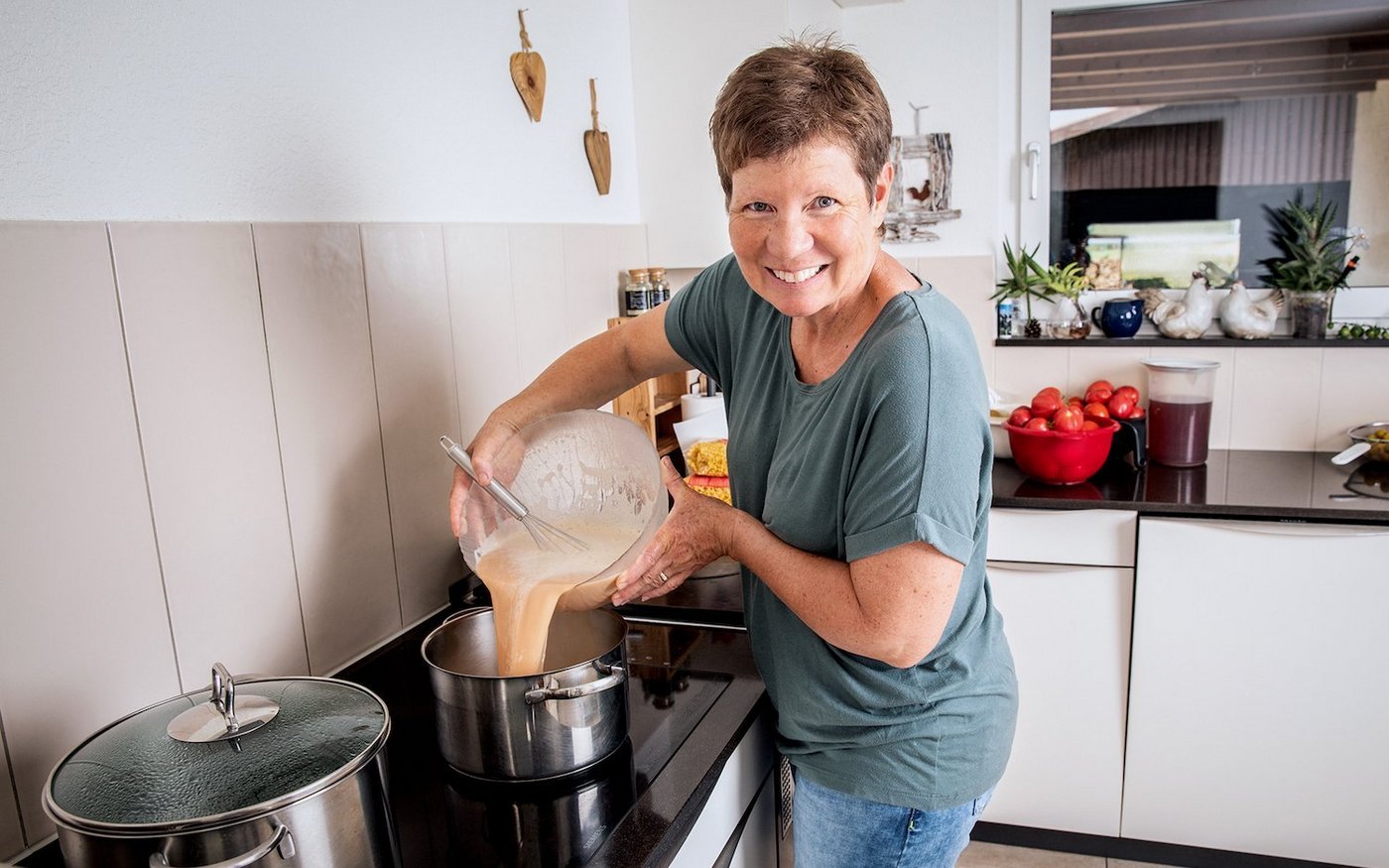 «Ich koche jeden Tag», sagt Agnes Hügli: «Das gehört zu meinem Job». Zusammen mit ihrem Mann Albert und Florian, einem ihrer drei Söhne, bewirtschaftet sie den Gehrenhof oberhalb von Brislach (BL). Hauptbetriebszweig sind mittlerweile die Legehennen, daneben betreibt die Familie noch etwas Grossviehmast und Ackerbau. Erwähnenswert sind sicher die Grünen Spargeln im Frühling und die Kürbisse im Herbst, welche in der Region ansonsten nicht sehr verbreitet sind. Dazu kommt als weiterer Betriebszweig das Angebot «Bim Buur in d'Schuel», bei dem Schulklassen auf den Bauernhof kommen. Die Landfrauenküche hat Agnes Hügli bisher als interessierte Zuschauerin mitverfolgt. «Ich fand es immer eine unterhaltsame Sendung», sagt sie. Nun ist sie selbst mit dabei. Bei ihrem Menü setzt sie auf Produkte vom Hof, die saisonal passen.