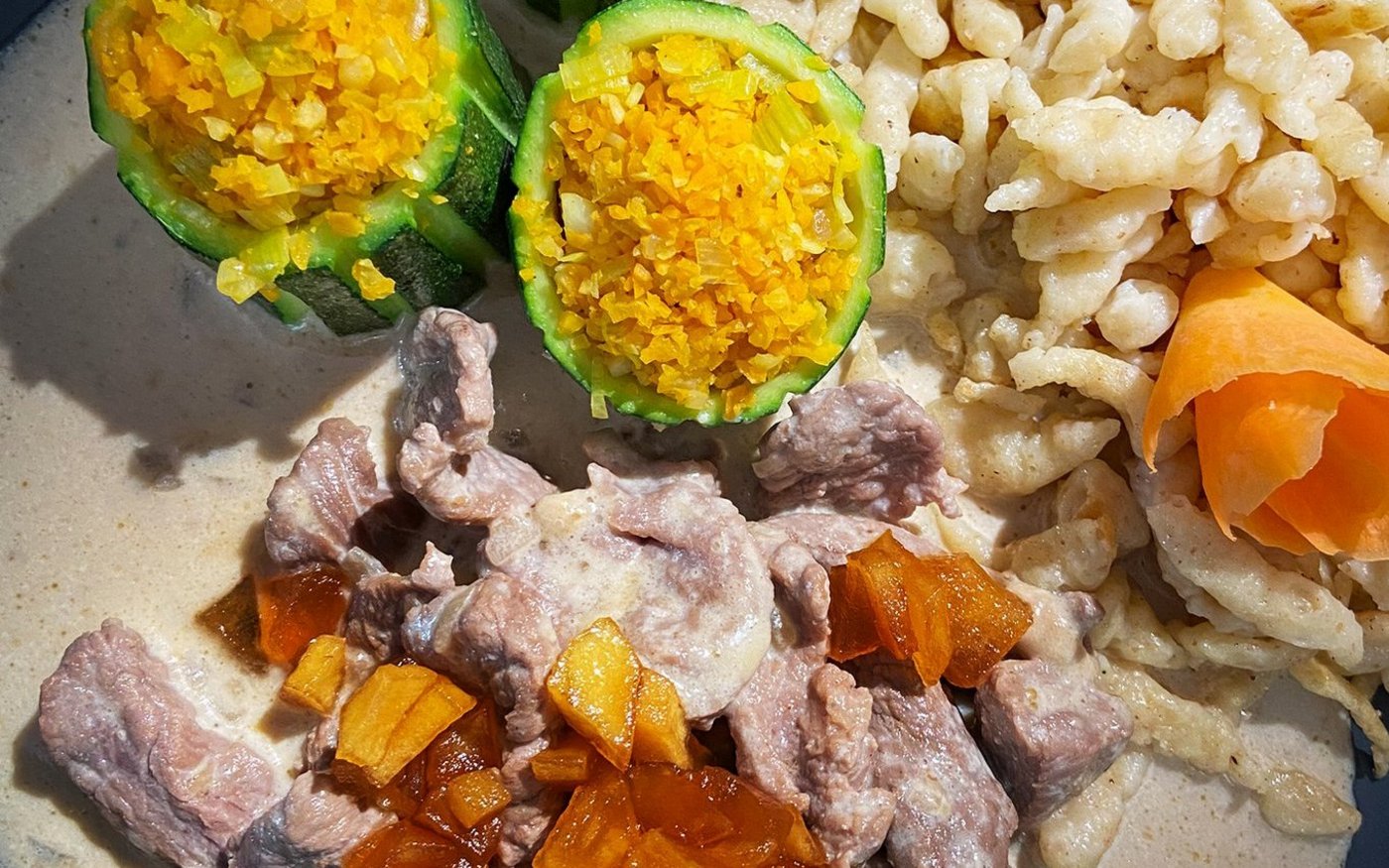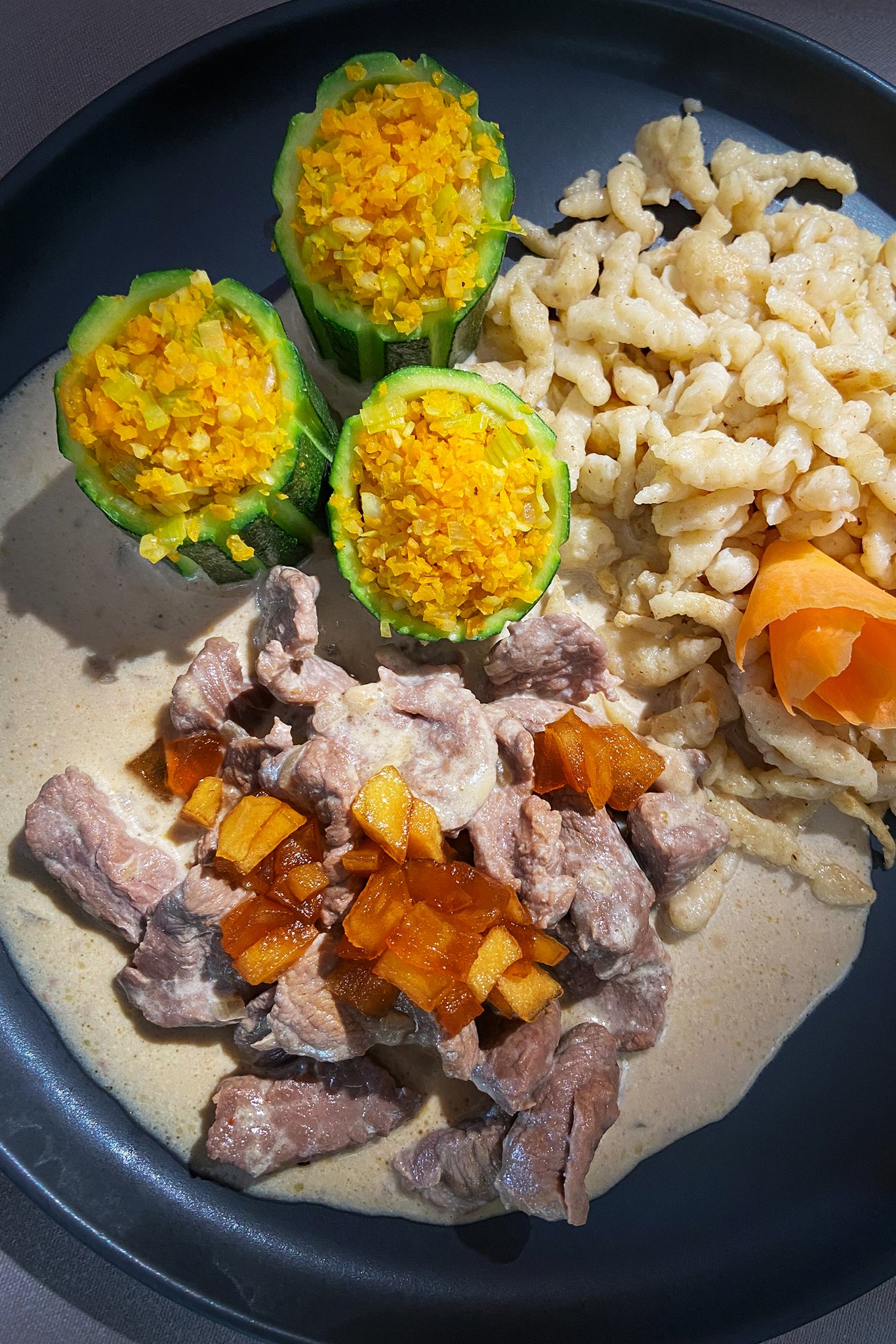 Je drei gefüllte Zucchetti auf vorgewärmte Teller anrichten. Spätzli dazu anrichten. Mit Rüeblirösli garnieren. Geschnetzeltes und Sauce dazu anrichten und mit karamellisierten Apfelstücken belegen.