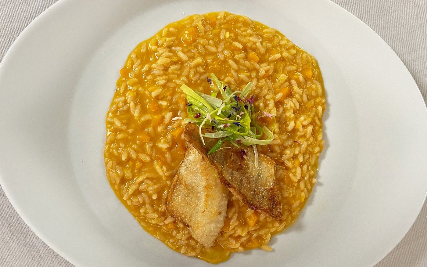 Den Kürbisrisotto mittig auf vorgewärmte Teller verteilen. Auf dem Risotto 2 Eglifilets anrichten und mit dem frittierten Lauch dekorieren. Die Filets mit warmer Butter – Weissweinsauce beträufeln. Mit Essblüte dekorieren.