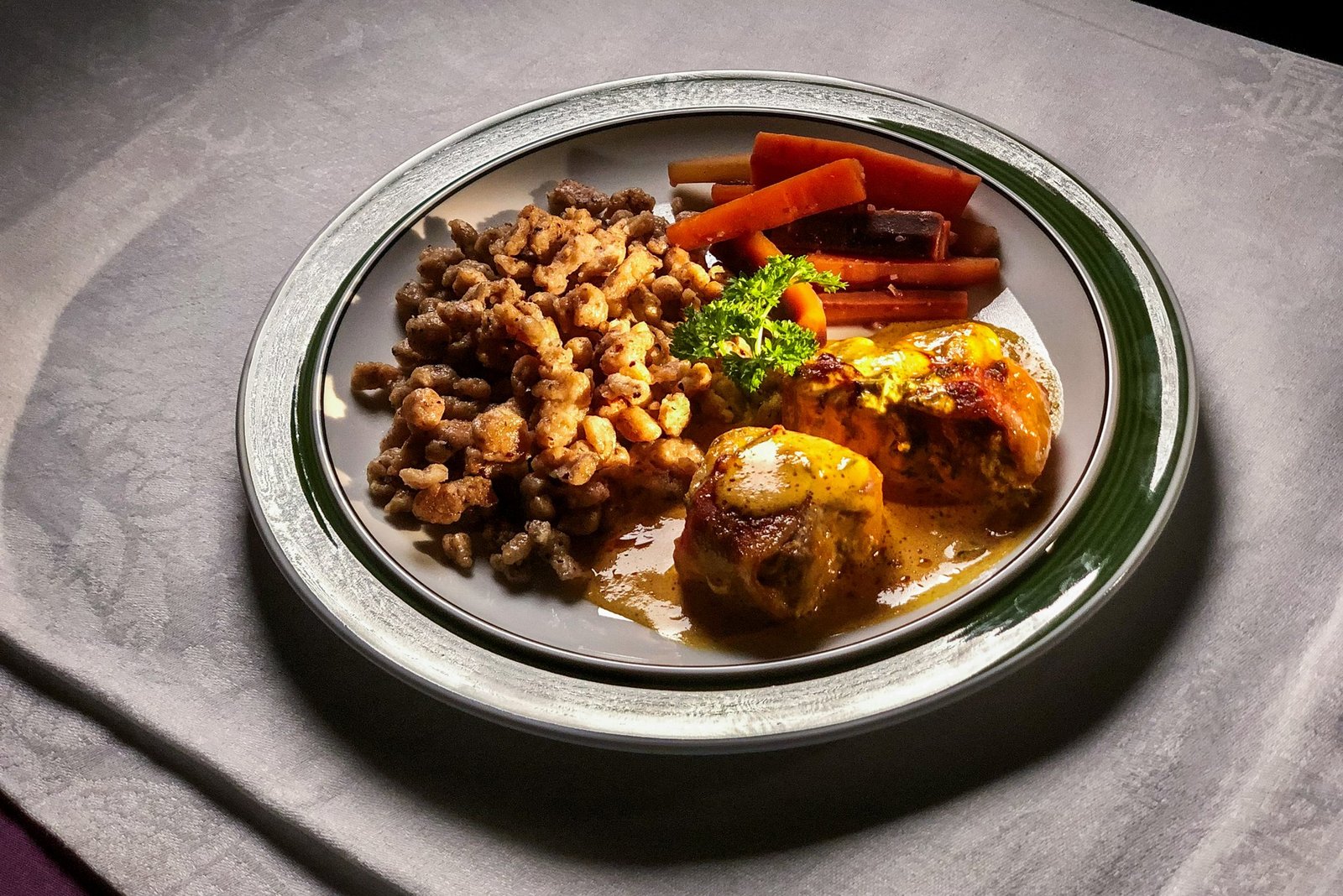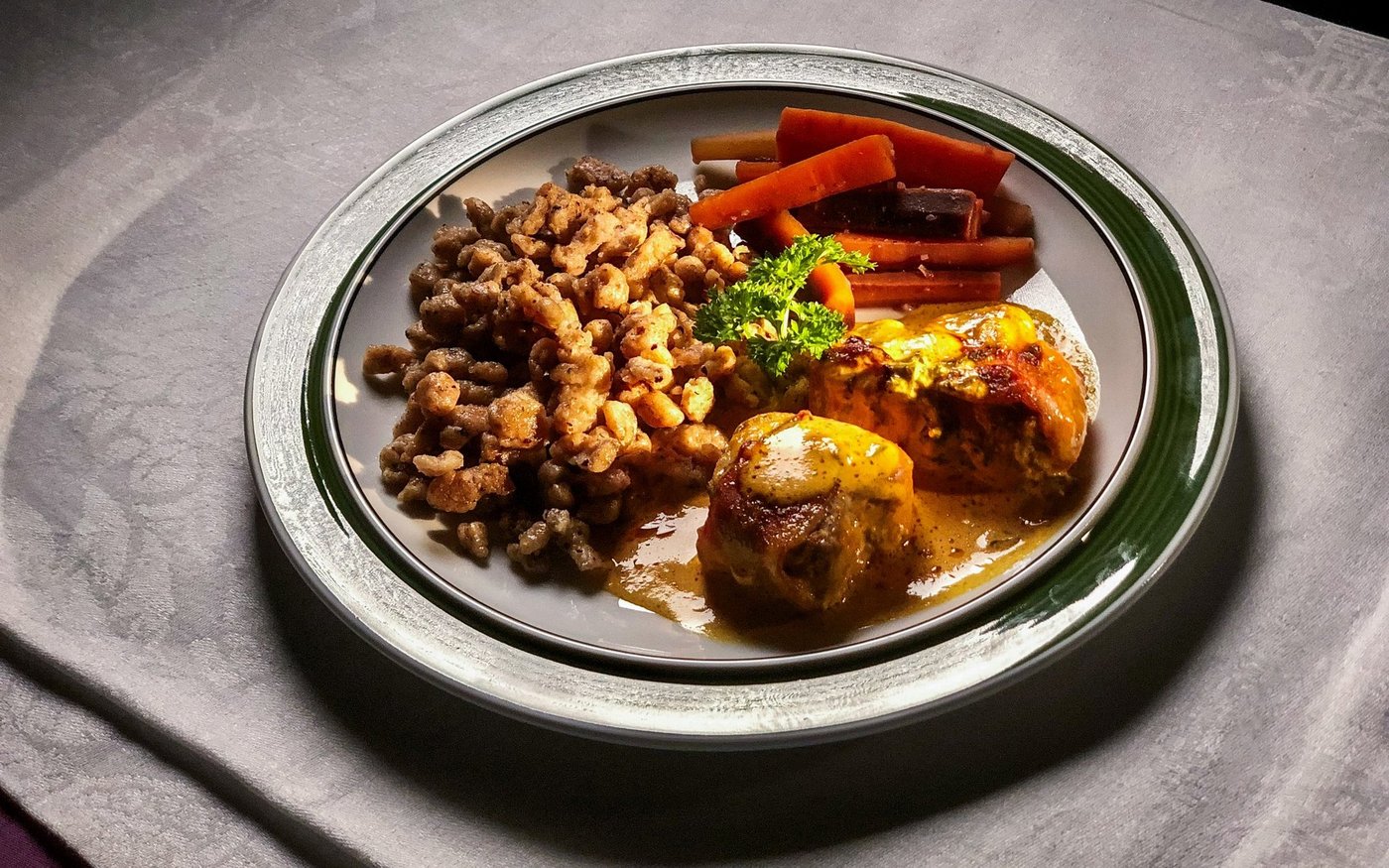 Mit der Fleischsauce auf vorgewärmten Teller einen Saucenspiegel bilden. Je zwei Partyfilettranchen darauf anrichten. Spätzli und Rüeblistängeli dazu anrichten. Mit einem Büschel Petersilie ausgarnieren.