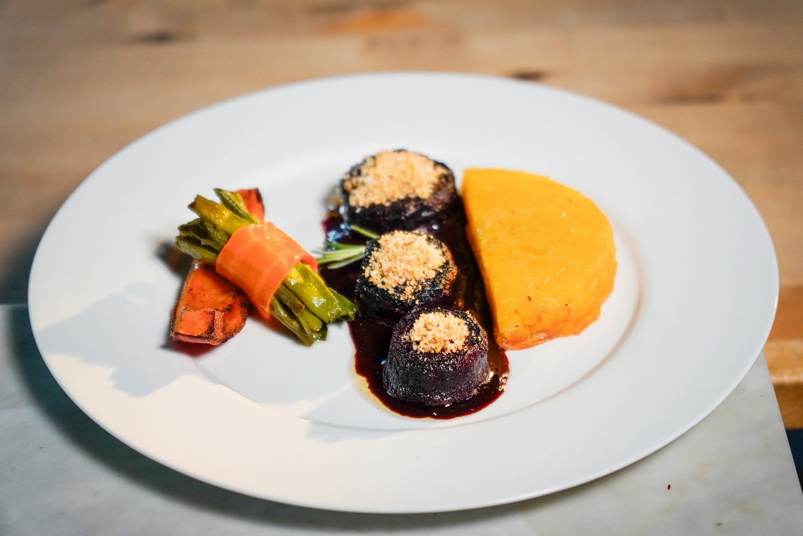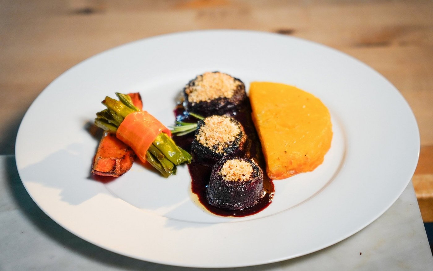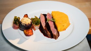 - Die Randen-Steaks mit dem Zwiebel-Streusel bestreuen. Mit der Randen-Sauce einen Saucenspiegel machen und die Randen-Steaks darauf anrichten.