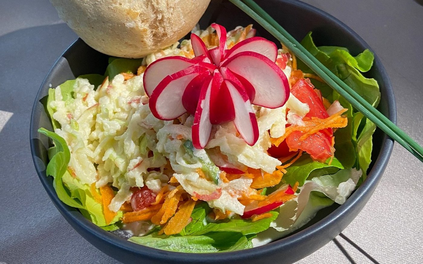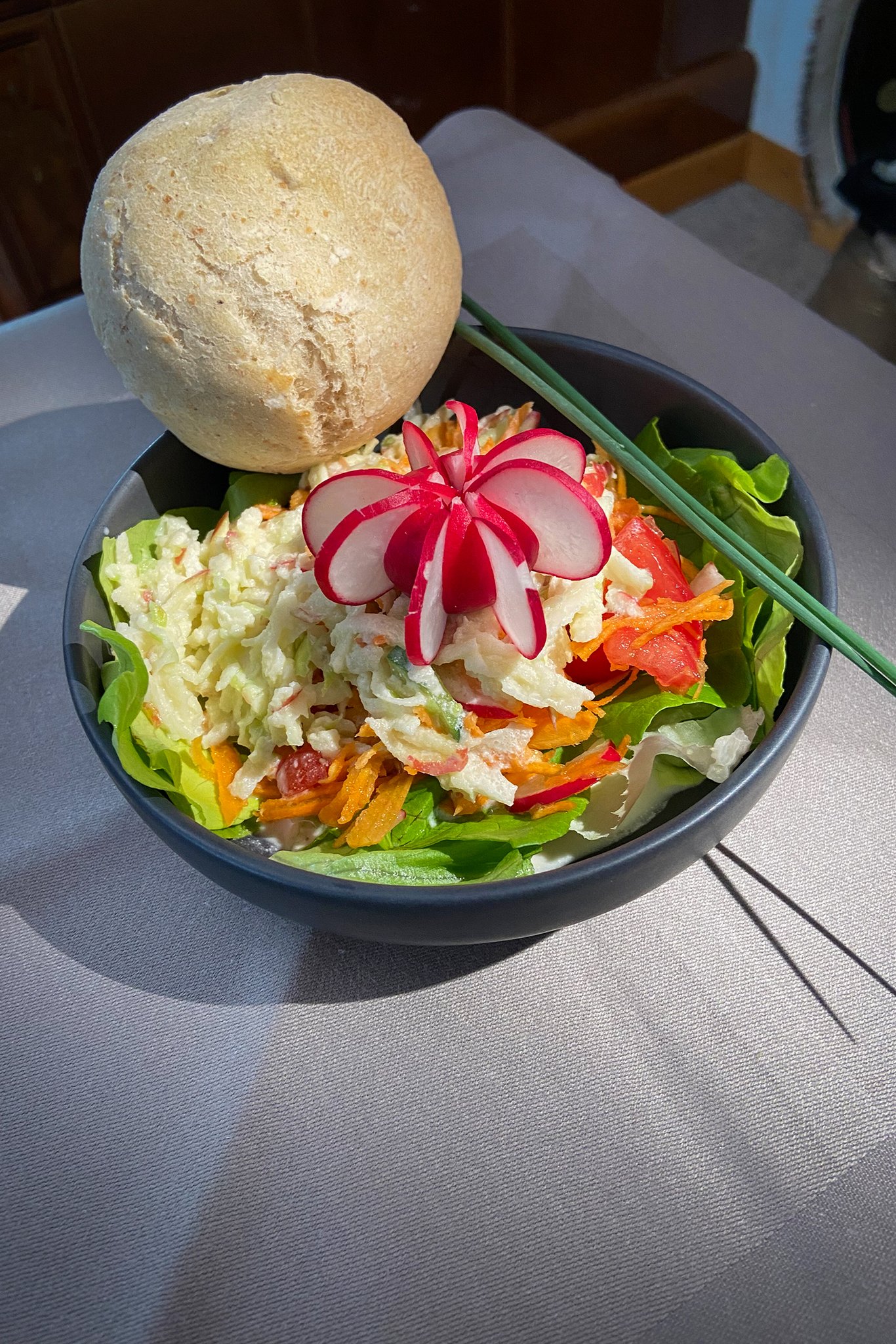 Blattsalat in Vorspeise-Schüsselchen legen, Apfel-Vinaigrette übers Gemüse verteilen. Das Gemüse auf dem Blattsalat anrichten. Eingeschnittene Radiesli auf dem Gemüse anrichten und die Radieslischeiben in die Einschnitte stecken. Schnittlauchhalme dazu legen. Brötchen werden zu 2/3 aufgeschnitten und über den Rand des Salatschüsselchens gelegt.