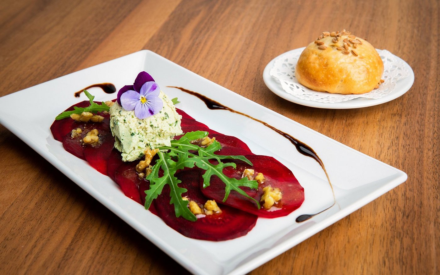 Randen-Scheiben in einer Längsreihe auf Vorspeiseteller anrichten. Ein paar Rucolablätter darauf anrichten. Eine Nocke Ricotta in der Mitte der Randen Linie anrichten. Randen mit Balsamico-Senf-Sauce nappieren und Baumnüssen bestreuen. Dinkel-Milchbrötchen separat dazu servieren, ausgeschmückt mit einem Stiefmütterchen.