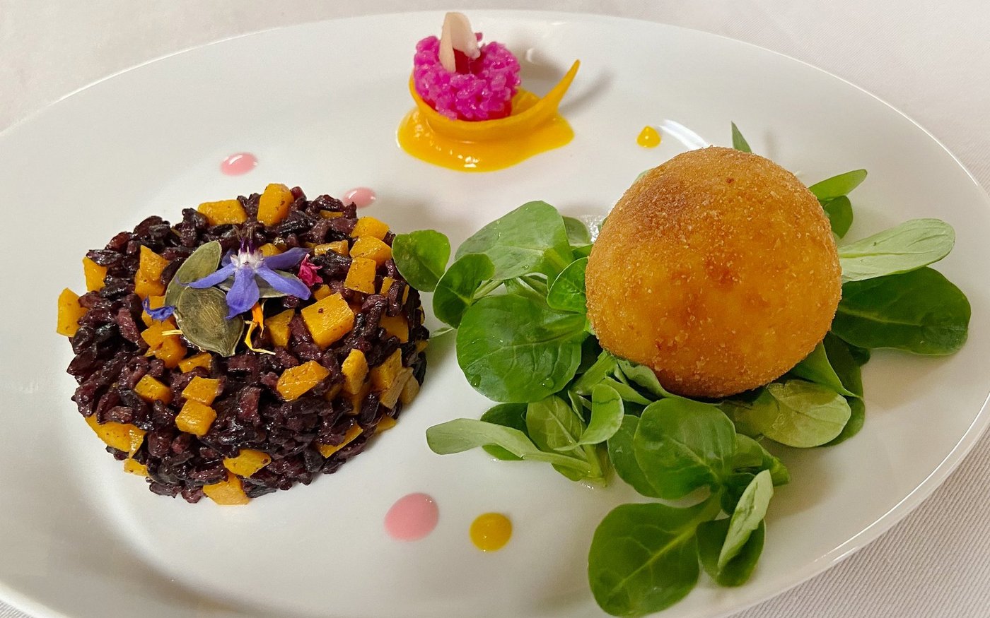 Für den schwarzen Reissalat mit Kürbiswürfeli eine 8cm runde Ausstechform neben dem Nüsslisalat platzieren. Zu 2/3 mit schwarzem Reis füllen und leicht andrücken. Die Ausstechform auslösen, den Reissalat mit einer Borretsch-Blüte und getrockneten Kürbiskernen garnieren.