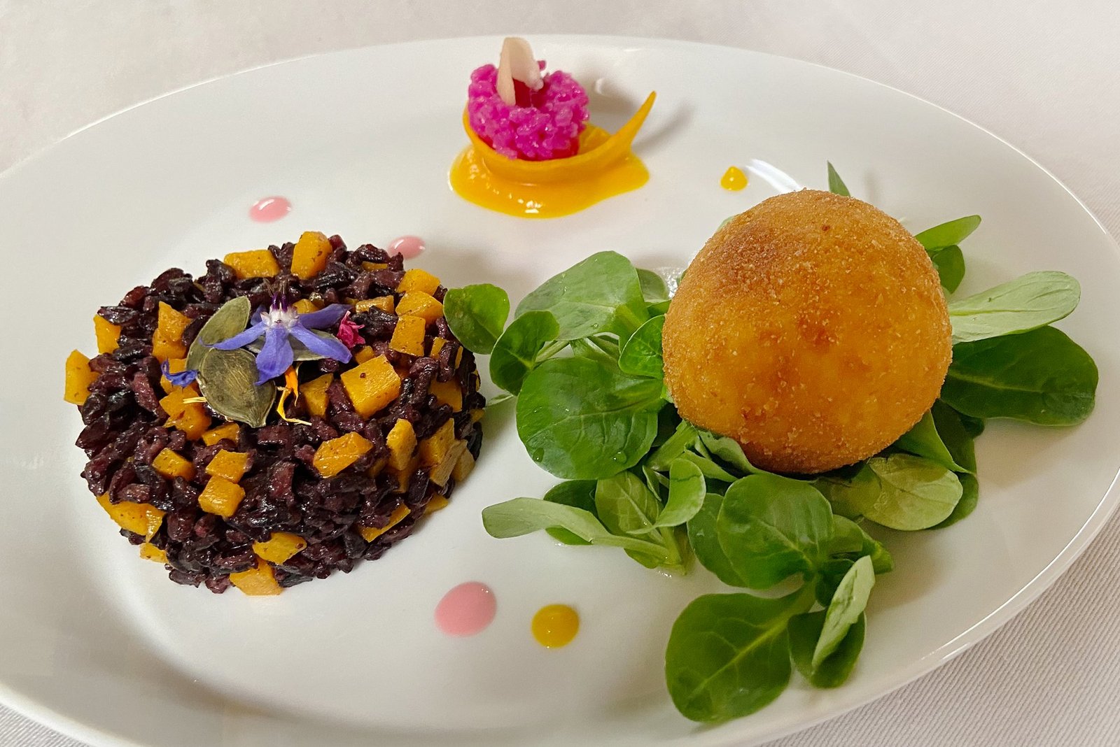 Eine Portion Nüsslisalat auf einem Vorspeisenteller anrichten und Dressing darüberträufeln. In die Mitte des Salates ein Arancini legen.