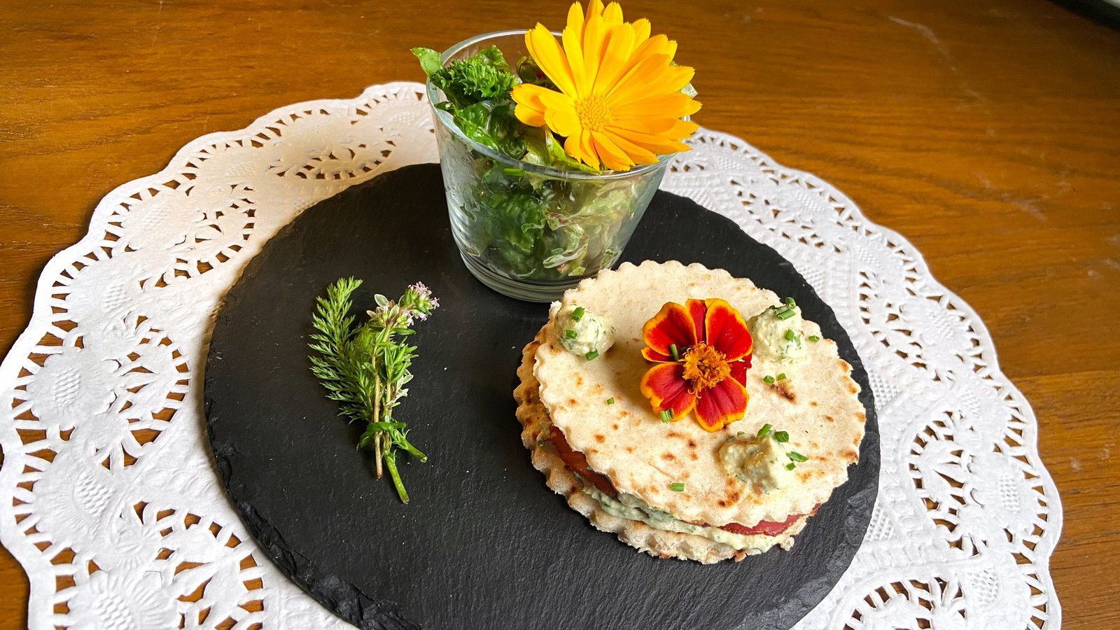 Je ein «Iklemmts» auf Vorspeiseteller anrichten. Salat dazu anrichten.