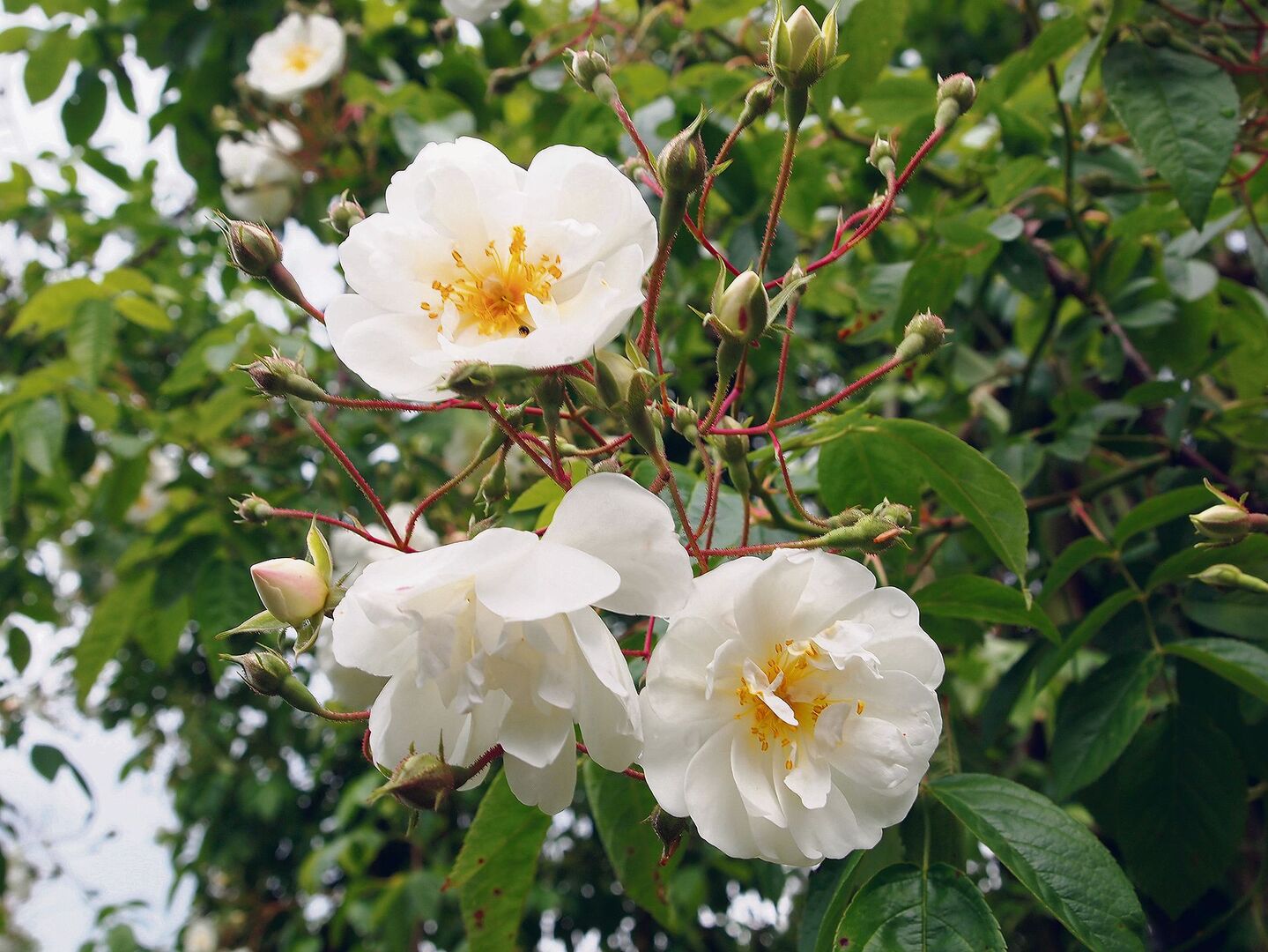 Viel zu selten lässt man die äusserst wuchsfreudigen Ramblerrosen in Bäume hineinwachsen. Sie wachsen schnell sieben Meter hoch und können aus einer Föhre oder einem eher altersschwachen (Obst-)Baum, der noch einen kräftigem Stamm hat, einen blühenden Rosenbaum machen. Ein so bewachsener Baum ist ideal für Vögel, die im Dornendickicht der Rosen gerne vor Katzen geschützt nisten. Im Winter bieten die Hagebutten den Tieren wertvolle Nahrung. Auch für Insekten sind mit Rosen bewachsene Bäume perfekt. Zudem geben sie dem Garten einen naturnahen Anstrich.