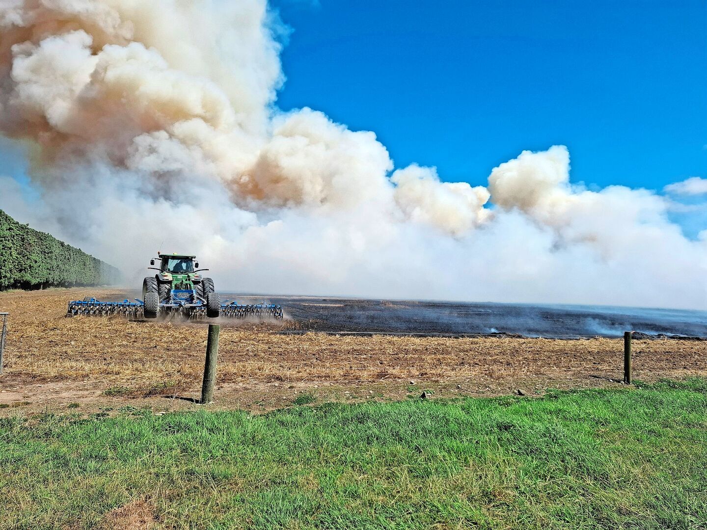 Nach der Ernte ist vor der Ernte. Deshalb müssen die Felder auch vorbereitet werden. Dies geschieht hier bei den Getreideflächen etwas anders. Nachdem das Feld abgeerntet wurde, habe ich mit einem Sternradrechen das Stroh vom Rand weg zur Mitte gebracht. Danach bin ich mit dem Grubber um das Feld herum gefahren, um eine Feuersperre zu errichten. Wenn der Wind dann in eine gute Richtung bläst, starten wir mit einem Quad, einem Traktor mit Grubber und einem Auto mit Anhänger inklusive Wassertank, Pumpe und Schlauch raus zum Feld. Mit einem Diesel-Benzingemisch beginnen wir auf der dem Wind entgegengesetzten Richtung, das Stroh und die Stoppeln anzuzünden. So brennen wir in die Richtung des Windes und haben das Feuer unter Kontrolle.