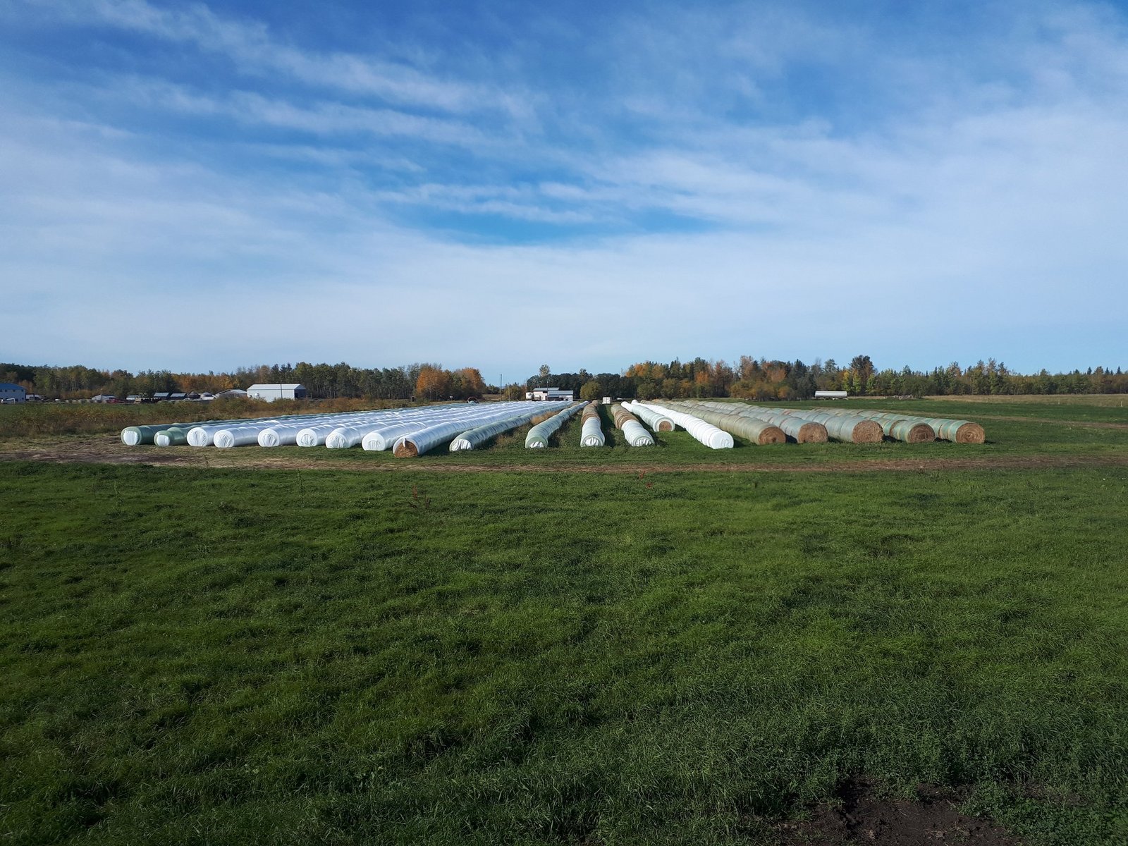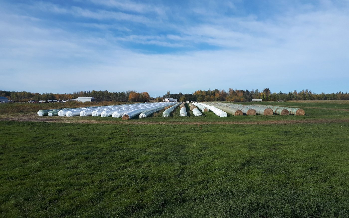Die Futterproduktion ging dieses Jahr ziemlich glatt über die Bühne. Neben 700 Ballen Heu wickelte die Crew 1243 Ballen Hafersilage. Ein Teil des Hafers wurde an die Schwade gemäht. Die Kühe werden nach dem Absetzten der Kälber in diese Felder gelassen und können dort von der Made grasen, bis der Schnee fällt oder sie alles gefressen haben – was auch immer zuerst kommt.