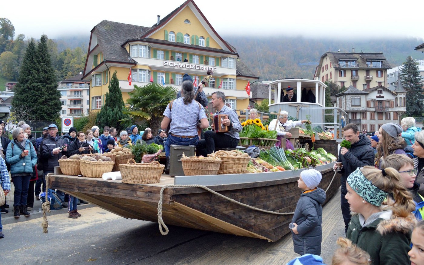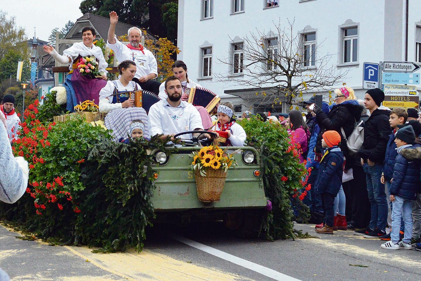 Am abwechslungsreichen und farbenfrohen Festumzug wirkten 675 Personen mit, und viele Tiere liefen durchs dichte Zuschauerspalier. 25 Oldtimer und alte Landmaschinen sowie etliche Pferdegespanne zogen die prächtig geschmückten Umzugswagen. Zu sehen war zum Beispiel die Landjugend Riviera beim Mosten nach alter Väter Sitte oder auch eine muntere Gruppe des örtlichen Altersheims.