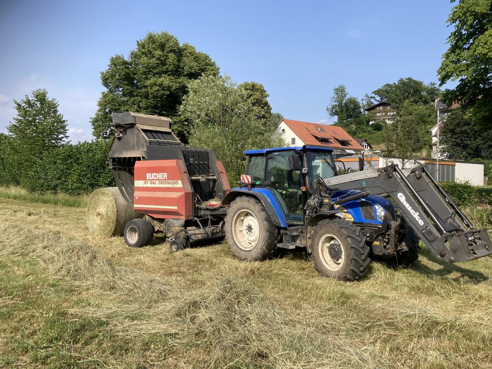 Die Heuernte in Deutschland ist jedes Jahr ein «Highlight» auf eine andere Art. Es sind nicht meine Lieblingsstücke, denn es ist alles sehr steil. Zwischendurch bekommt man schon mal fast ein «Herzchriesi», wenn man das Gefühl hat, man kippe um – ohne Doppelräder geht gar nichts. Viele Stellen sind gar nicht erst befahrbar und es ist viel Handarbeit angesagt, doch mit einem coolen Team und Musik macht auch diese Arbeit Spass!
